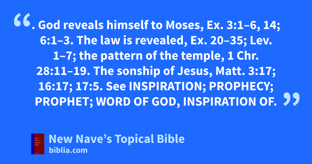REVELATION. God reveals himself to Moses, Ex. 3:1–6, 14; 6:1–3. The law is revealed, Ex. 20–35; Lev. 1–7; the pattern of the temple, 1 Chr. 28:11–19. The sonship of Jesus, Matt. 3:17; 16:17; 17:5. See Inspiration; Prophecy; Prophet; Word of God, Inspiration of.
