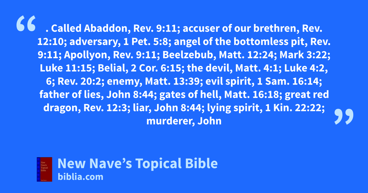 SATAN. Called Abaddon, Rev. 9:11; accuser of our brethren, Rev. 12:10; adversary, 1 Pet. 5:8; angel of the bottomless pit, Rev. 9:11; Apollyon, Rev. 9:11; Beelzebub, Matt. 12:24; Mark 3:22; Luke 11:15; Belial, 2 Cor. 6:15; the devil, Matt. 4:1; Luke 4:2, 6; Rev. 20:2; enemy, Matt. 13:39; evil spirit, 1 Sam. 16:14; father of lies, John 8:44; gates of hell, Matt. 16:18; great red dragon, Rev. 12:3; liar, John 8:44; lying spirit, 1 Kin. 22:22; murderer, John 8:44; old serpent, Rev. 12:9; 20:2; power of darkness, Col. 1:13; prince of this world, John 12:31; 14:30; 16:11; of devils, Matt. 12:24; of the power of the air, Eph. 2:2; ruler of the darkness of this world, Eph. 6:12; Satan, 1 Chr. 21:1; Job 1:6; John 13:27; Acts 5:3; 26:18; Rom. 16:20; serpent, Gen. 3:4, 14; 2 Cor. 11:3; spirit that works in the children of disobedience, Eph. 2:2; tempter, Matt. 4:3; 1 Thess. 3:5; the god of this world, 2 Cor. 4:4; unclean spirit, Matt. 12:43; wicked one, Matt. 13:19, 38. Kingdom of, to be destroyed, 2 Sam. 23:6, 7, with context; Matt. 12:29; 13:30; Luke 11:21, 22; 1 John 3:8. Synagogue of, Rev. 2:9; 3:9.