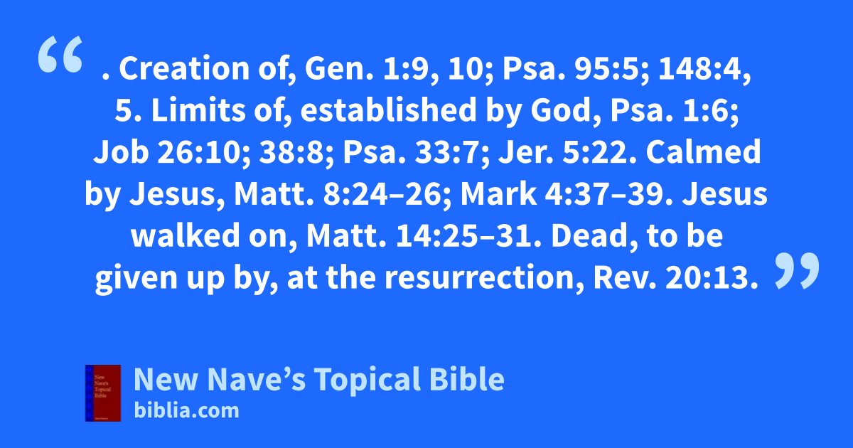SEA. Creation of, Gen. 1:9, 10; Psa. 95:5; 148:4, 5. Limits of, established by God, Psa. 1:6; Job 26:10; 38:8; Psa. 33:7; Jer. 5:22. Calmed by Jesus, Matt. 8:24–26; Mark 4:37–39. Jesus walked on, Matt. 14:25–31. Dead, to be given up by, at the resurrection, Rev. 20:13.