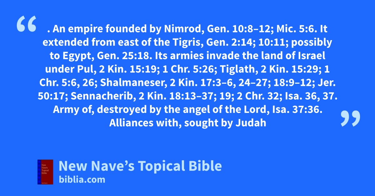 ASSYRIA. An empire founded by Nimrod, Gen. 10:8–12; Mic. 5:6. It extended from east of the Tigris, Gen. 2:14; 10:11; possibly to Egypt, Gen. 25:18. Its armies invade the land of Israel under Pul, 2 Kin. 15:19; 1 Chr. 5:26; Tiglath, 2 Kin. 15:29; 1 Chr. 5:6, 26; Shalmaneser, 2 Kin. 17:3–6, 24–27; 18:9–12; Jer. 50:17; Sennacherib, 2 Kin. 18:13–37; 19; 2 Chr. 32; Isa. 36, 37. Army of, destroyed by the angel of the Lord, Isa. 37:36. Alliances with, sought by Judah and Israel, Hos. 5:13. Israelites carried captive into, 2 Kin. 17:3–23. Jews carried captive to, 2 Kin. 24, 25; 2 Chr. 36:5–21. Invaded by Pharaoh Neco, 2 Kin. 23:29. Commerce of, Ezek. 27:23. Productiveness of, Isa. 36:17. Prophecies concerning, Isa. 7:17–25; 8:4–10; 10:5–34; 14:24–28; 19:23–25; 20; 30:27–33; 31:8, 9; 37:21–35; Jer. 1:15; Ezek. 31; Jonah 3:1–4; Nah. 1–3; Zeph. 2:13–15; Zech. 10:11. Prophecies of captivity of Israelites in, Hos. 9:3; 11:5, 11. Idols of. See Adrammelech; Anammelech; Nisroch; Tartak.