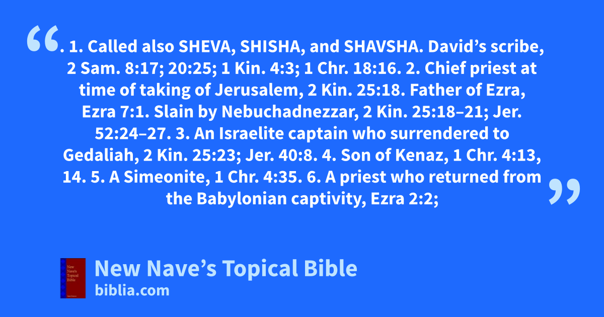 SERAIAH. 1. Called also Sheva, Shisha, and Shavsha. David’s scribe, 2 Sam. 8:17; 20:25; 1 Kin. 4:3; 1 Chr. 18:16. 2. Chief priest at time of taking of Jerusalem, 2 Kin. 25:18. Father of Ezra, Ezra 7:1. Slain by Nebuchadnezzar, 2 Kin. 25:18–21; Jer. 52:24–27. 3. An Israelite captain who surrendered to Gedaliah, 2 Kin. 25:23; Jer. 40:8. 4. Son of Kenaz, 1 Chr. 4:13, 14. 5. A Simeonite, 1 Chr. 4:35. 6. A priest who returned from the Babylonian captivity, Ezra 2:2; Neh. 12:1, 12. Called Azariah, Neh. 7:7. 7. One who sealed the covenant with Nehemiah, Neh. 10:2. Possibly identical with 6, above. 8. A ruler of the temple after the captivity, Neh. 11:11. 9. Son of Azriel. Commanded by king Jehoiakim to seize Jeremiah, Jer. 36:26. 10. A servant of Zedekiah, Jer. 51:59, 61.