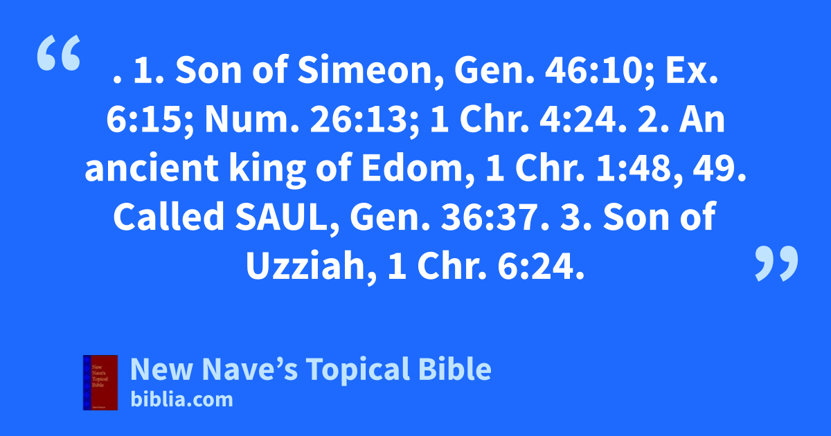 SHAUL. 1. Son of Simeon, Gen. 46:10; Ex. 6:15; Num. 26:13; 1 Chr. 4:24. 2. An ancient king of Edom, 1 Chr. 1:48, 49. Called Saul, Gen. 36:37. 3. Son of Uzziah, 1 Chr. 6:24.
