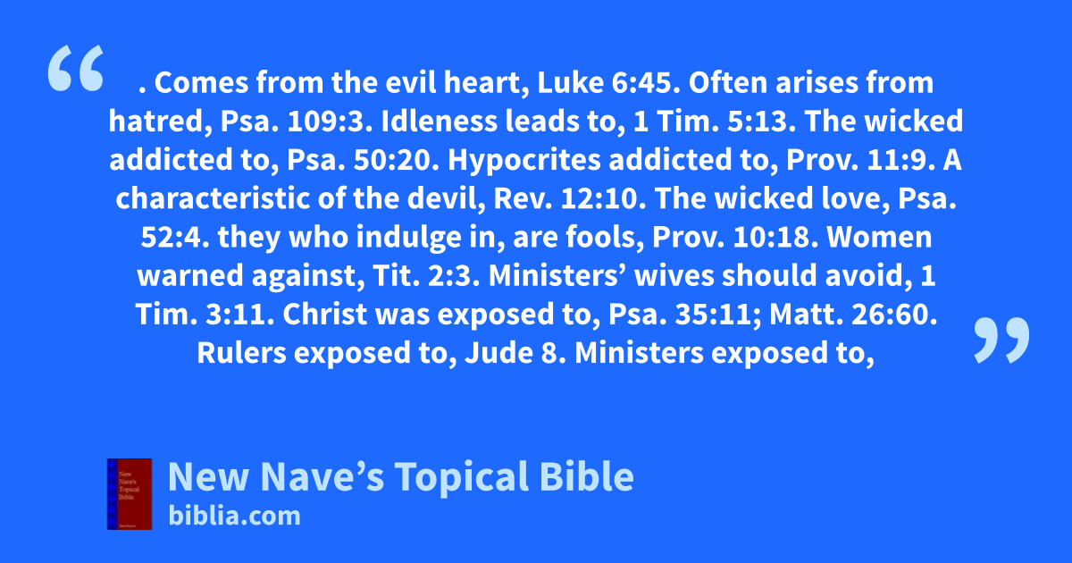 SLANDER. Comes from the evil heart, Luke 6:45. Often arises from hatred, Psa. 109:3. Idleness leads to, 1 Tim. 5:13. The wicked addicted to, Psa. 50:20. Hypocrites addicted to, Prov. 11:9. A characteristic of the devil, Rev. 12:10. The wicked love, Psa. 52:4. they who indulge in, are fools, Prov. 10:18. Women warned against, Tit. 2:3. Ministers’ wives should avoid, 1 Tim. 3:11. Christ was exposed to, Psa. 35:11; Matt. 26:60. Rulers exposed to, Jude 8. Ministers exposed to, Rom. 3:8; 2 Cor. 6:8. The nearest relations exposed to, Psa. 50:20. Saints exposed to, Psa. 38:12; 109:2; 1 Pet. 4:4. Saints should keep their tongues from, Psa. 34:13, with 1 Pet. 3:10; should lay aside, Eph. 4:31; should be warned against, Tit. 3:1, 2; should give no occasion for, 1 Pet. 2:12; 3:16; should return good for, 1 Cor. 4:13; blessed in enduring, Matt. 5:11; characterized as avoiding, Psa. 15:1, 3. Should not be listened to, 1 Sam. 24:9; causes anger, Prov. 25:23. Effects of: Separating friends, Prov. 16:28; 17:9; deadly wounds, Prov. 18:8; 26:22; strife, Prov. 26:20; discord among brethren, Prov. 6:19; murder, Psa. 31:13; Ezek. 22:9. The tongue of, is a scourge, Job 5:21; is venomous, Psa. 140:3; Eccl. 10:11; is destructive, Prov. 11:9. End of, is mischievous madness, Eccl. 10:13. Men shall give account for, Matt. 12:36. Punishment for, Deut. 19:16–21.—Bible Text-Book.
