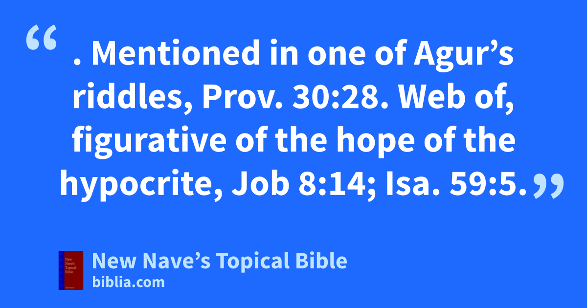 SPIDER. Mentioned in one of Agur’s riddles, Prov. 30:28. Web of, figurative of the hope of the hypocrite, Job 8:14; Isa. 59:5.