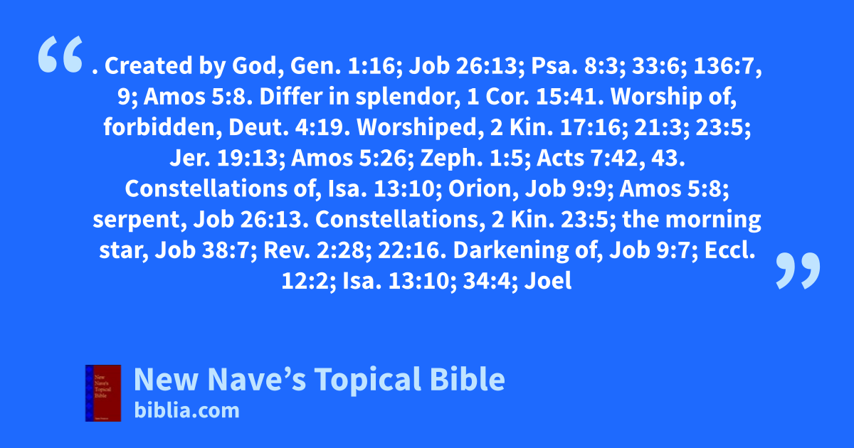 STARS. Created by God, Gen. 1:16; Job 26:13; Psa. 8:3; 33:6; 136:7, 9; Amos 5:8. Differ in splendor, 1 Cor. 15:41. Worship of, forbidden, Deut. 4:19. Worshiped, 2 Kin. 17:16; 21:3; 23:5; Jer. 19:13; Amos 5:26; Zeph. 1:5; Acts 7:42, 43. Constellations of, Isa. 13:10; Orion, Job 9:9; Amos 5:8; serpent, Job 26:13. Constellations, 2 Kin. 23:5; the morning star, Job 38:7; Rev. 2:28; 22:16. Darkening of, Job 9:7; Eccl. 12:2; Isa. 13:10; 34:4; Joel 2:10; 3:15; Rev. 8:11, 12. Comets, Jude 13. Falling of, Dan. 8:10; Matt. 24:29; Mark 13:25; Rev. 6:13; 8:10; 9:1; 12:4. Guides the wise men, Matt. 2:2, 7, 9, 10.