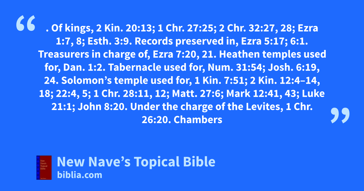 STOREHOUSES. Of kings, 2 Kin. 20:13; 1 Chr. 27:25; 2 Chr. 32:27, 28; Ezra 1:7, 8; Esth. 3:9. Records preserved in, Ezra 5:17; 6:1. Treasurers in charge of, Ezra 7:20, 21. Heathen temples used for, Dan. 1:2. Tabernacle used for, Num. 31:54; Josh. 6:19, 24. Solomon’s temple used for, 1 Kin. 7:51; 2 Kin. 12:4–14, 18; 22:4, 5; 1 Chr. 28:11, 12; Matt. 27:6; Mark 12:41, 43; Luke 21:1; John 8:20. Under the charge of the Levites, 1 Chr. 26:20. Chambers provided in the temple for various kinds of offerings, Neh. 10:38, 39; 13:5, 9, 12; Mal. 3:10. Priests and Levites in charge of, 1 Chr. 9:26; 26:20–28; Neh. 12:44; 13:13. See Barn.