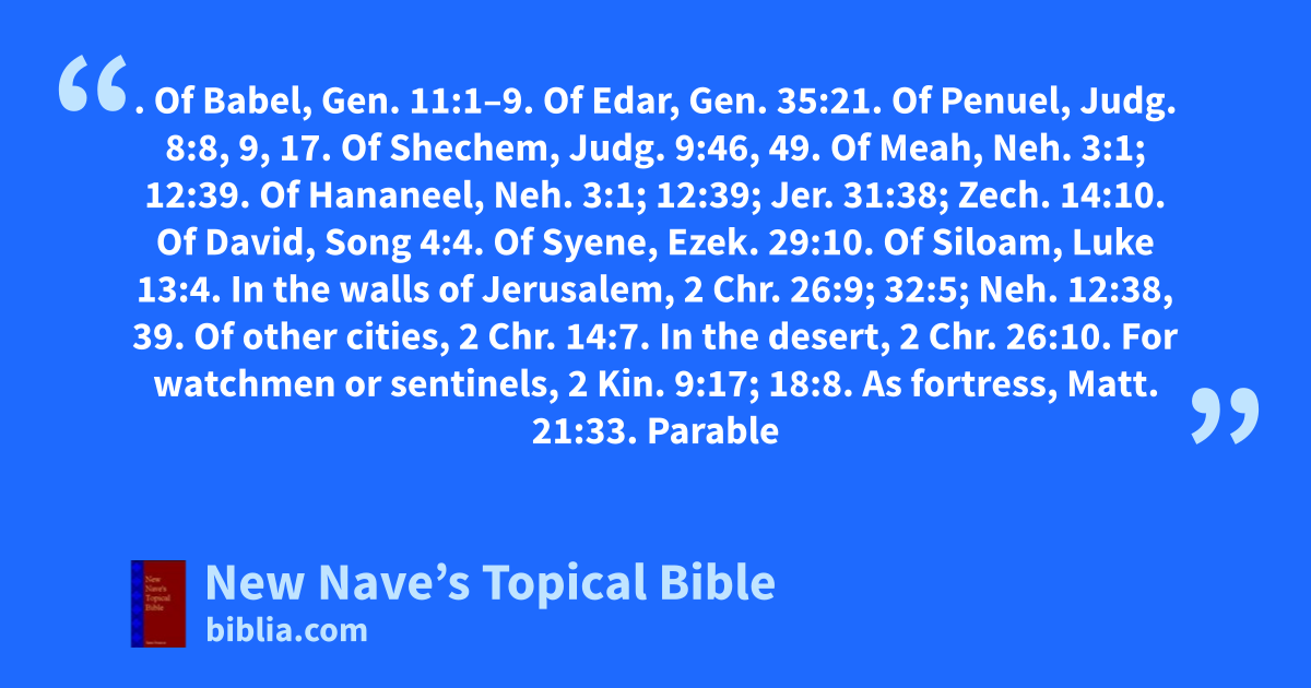 TOWER. Of Babel, Gen. 11:1–9. Of Edar, Gen. 35:21. Of Penuel, Judg. 8:8, 9, 17. Of Shechem, Judg. 9:46, 49. Of Meah, Neh. 3:1; 12:39. Of Hananeel, Neh. 3:1; 12:39; Jer. 31:38; Zech. 14:10. Of David, Song 4:4. Of Syene, Ezek. 29:10. Of Siloam, Luke 13:4. In the walls of Jerusalem, 2 Chr. 26:9; 32:5; Neh. 12:38, 39. Of other cities, 2 Chr. 14:7. In the desert, 2 Chr. 26:10. For watchmen or sentinels, 2 Kin. 9:17; 18:8. As fortress, Matt. 21:33. Parable of, Luke 14:28, 29. See Forts.