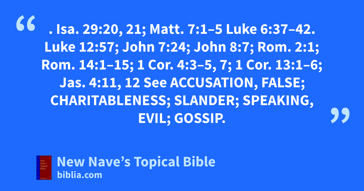 UNCHARITABLENESS. Isa. 29:20, 21; Matt. 7:1–5 Luke 6:37–42. Luke 12:57; John 7:24; John 8:7; Rom. 2:1; Rom. 14:1–15; 1 Cor. 4:3–5, 7; 1 Cor. 13:1–6; Jas. 4:11, 12 See Accusation, False; Charitableness; Slander; Speaking, Evil; Gossip.
