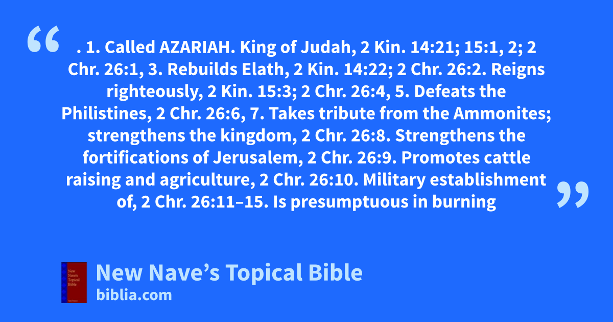 UZZIAH. 1. Called Azariah. King of Judah, 2 Kin. 14:21; 15:1, 2; 2 Chr. 26:1, 3. Rebuilds Elath, 2 Kin. 14:22; 2 Chr. 26:2. Reigns righteously, 2 Kin. 15:3; 2 Chr. 26:4, 5. Defeats the Philistines, 2 Chr. 26:6, 7. Takes tribute from the Ammonites; strengthens the kingdom, 2 Chr. 26:8. Strengthens the fortifications of Jerusalem, 2 Chr. 26:9. Promotes cattle raising and agriculture, 2 Chr. 26:10. Military establishment of, 2 Chr. 26:11–15. Is presumptuous in burning incense; stricken with leprosy; quarantined, 2 Chr. 26:16–21; 2 Kin. 15:5. Jotham regent during quarantine of, 2 Kin. 15:5; 2 Chr. 26:21. Death of, 2 Kin. 15:7; 2 Chr. 26:23. History of, written by Isaiah, 2 Chr. 26:22; Isa. 1:1. Earthquake in the reign of, Amos 1:1; Zech. 14:5. 2. Son of Uriel, 1 Chr. 6:24. 3. Father of Jehonathan, 1 Chr. 27:25. 4. A priest. Puts away his Gentile wife, Ezra 10:21. 5. Father of Athaiah, Neh. 11:4.