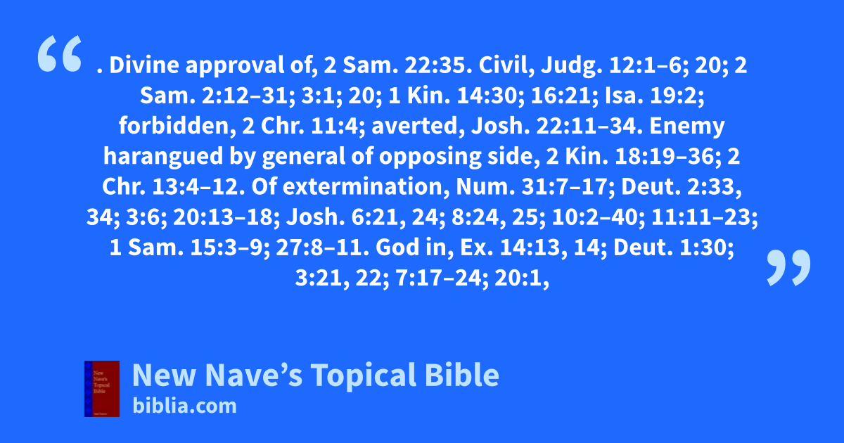 WAR. Divine approval of, 2 Sam. 22:35. Civil, Judg. 12:1–6; 20; 2 Sam. 2:12–31; 3:1; 20; 1 Kin. 14:30; 16:21; Isa. 19:2; forbidden, 2 Chr. 11:4; averted, Josh. 22:11–34. Enemy harangued by general of opposing side, 2 Kin. 18:19–36; 2 Chr. 13:4–12. Of extermination, Num. 31:7–17; Deut. 2:33, 34; 3:6; 20:13–18; Josh. 6:21, 24; 8:24, 25; 10:2–40; 11:11–23; 1 Sam. 15:3–9; 27:8–11. God in, Ex. 14:13, 14; Deut. 1:30; 3:21, 22; 7:17–24; 20:1, 4; 31:6–8, 23; 32:29, 30; Josh. 1:1, 5–7, 9; Judg. 1:2; 6:16; 7:9; 11:29; 1 Sam. 17:45–47; 19:5; 30:7, 8; 2 Sam. 5:22–24; 22:18; 1 Kin. 20:28; Psa. 18:34; 76:3; Jer. 46:15; Amos 5:8, 9; Zech. 10:5. God uses, as a judgment, Ex. 23:24; Lev. 26:17, 31–39; Deut. 28:25–68; 32:30; Judg. 2:14; 2 Kin. 15:37; 1 Chr. 5:22, 26; 21:12; 2 Chr. 12:1–12; 15:6; 24:23, 24; 33:11; 36; Job 19:29; Psa. 44:9–16; 60:1–3; 105:25; Isa. 5:1–8, 25–30; 9:8–12; 13:3, 4, 9; 19:2; 34:2–6; 43:28; 45:7; Jer. 12:7, 12; 46:15–17, 21; 47:6, 7; 48:10; 49:5; 50:25; Ezek. 23:22–25; Amos 3:6; 4:11; Zeph. 1:7–18; Zech. 8:10; 14:2. Repugnant to God, 1 Chr. 22:8, 9; Psa. 68:30; 120:6, 7; Rev. 13:10. God sends panic in, Ex. 15:14–16; threatens defeat in, Deut. 32:25; 1 Sam. 2:10; 2 Chr. 18:12–16; Isa. 30:15–17; Ezek. 15:6–8; 21:9–17; inflicts defeat in, Josh. 7:12, 13; 2 Chr. 12:5–8; 24:23, 24; Psa. 76:3; 78:66; 79:10; Isa. 5:25; Jer. 46:15, 16. Counsels of, Josh. 22:10–34; Judg. 7:10, 11; 2 Sam. 16:20; 17:1–15; Psa. 48:4–7; Prov. 11:14; 20:18. Wisdom required in, Prov. 21:22; 24:6; Eccl. 9:14–18; Luke 14:31, 32. Tumult of, Amos 2:2. Slain in, neglected, Isa. 14:19; 18:6. Evils of, 2 Sam. 2:26; Psa. 46:8; 79:1–3; 137:9; Isa. 3:5, 25, 26; 5:29, 30; 6:11, 12; 9:5, 19–21; 13:15, 16; 15; 16:9, 10; 18:6; 19:2–16; 32:13, 14; 33:8, 9; 34:7–15; Jer. 4:19–31; 5:16, 17; 6:24–26; 7:33, 34; 8:16, 17; 9:10–21; 10:20; 13:14; 14:18; 15:8, 9; 19:7–9; 25:33; 46:3–12; 47:3; 48:28, 33; 51:30–58; Lam. 1–5; Ezek. 33:27; 39:17–19; Hos. 10:14; 13:16; Joel 2:2–10; Amos 1:13; 6:9, 10; 8:3; Nah. 2:10; 3:3, 10; Zech. 14:2; Luke 21:20–26; Rev. 19:17, 18. To cease, Psa. 46:9; Isa. 2:4; Mic. 4:3. Wars and rumors of, Matt. 24:6; Mark 13:7; Luke 21:9. See Armies; Arms; Fort; Soldiers; Strategy; Tower; Watchman.