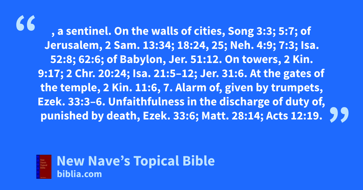 WATCHMAN, a sentinel. On the walls of cities, Song 3:3; 5:7; of Jerusalem, 2 Sam. 13:34; 18:24, 25; Neh. 4:9; 7:3; Isa. 52:8; 62:6; of Babylon, Jer. 51:12. On towers, 2 Kin. 9:17; 2 Chr. 20:24; Isa. 21:5–12; Jer. 31:6. At the gates of the temple, 2 Kin. 11:6, 7. Alarm of, given by trumpets, Ezek. 33:3–6. Unfaithfulness in the discharge of duty of, punished by death, Ezek. 33:6; Matt. 28:14; Acts 12:19.