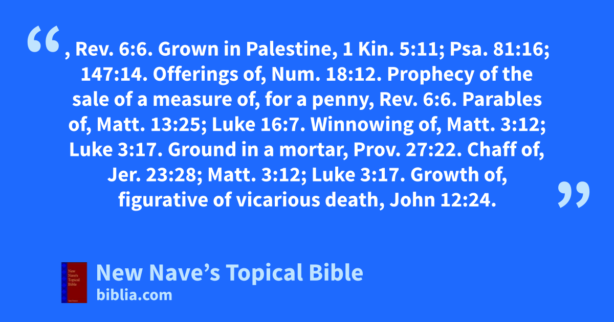 WHEAT, Rev. 6:6. Grown in Palestine, 1 Kin. 5:11; Psa. 81:16; 147:14. Offerings of, Num. 18:12. Prophecy of the sale of a measure of, for a penny, Rev. 6:6. Parables of, Matt. 13:25; Luke 16:7. Winnowing of, Matt. 3:12; Luke 3:17. Ground in a mortar, Prov. 27:22. Chaff of, Jer. 23:28; Matt. 3:12; Luke 3:17. Growth of, figurative of vicarious death, John 12:24.