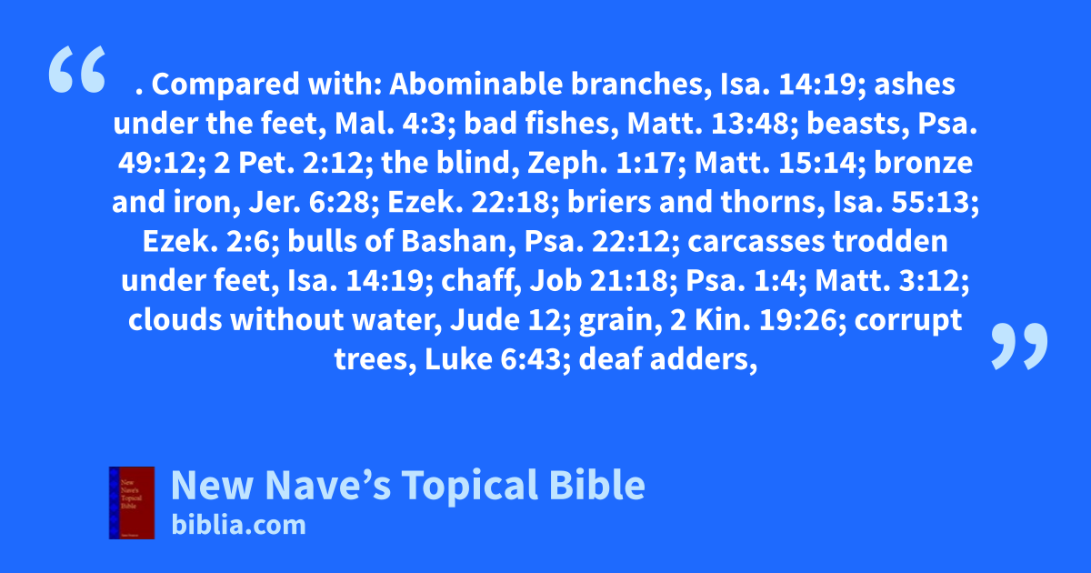 WICKED. Compared with: Abominable branches, Isa. 14:19; ashes under the feet, Mal. 4:3; bad fishes, Matt. 13:48; beasts, Psa. 49:12; 2 Pet. 2:12; the blind, Zeph. 1:17; Matt. 15:14; bronze and iron, Jer. 6:28; Ezek. 22:18; briers and thorns, Isa. 55:13; Ezek. 2:6; bulls of Bashan, Psa. 22:12; carcasses trodden under feet, Isa. 14:19; chaff, Job 21:18; Psa. 1:4; Matt. 3:12; clouds without water, Jude 12; grain, 2 Kin. 19:26; corrupt trees, Luke 6:43; deaf adders, Psa. 58:4; dogs, Prov. 26:11; Matt. 7:6; 2 Pet. 2:22; dross, Psa. 119:119; Ezek. 22:18, 19; early dew that passes away, Hos. 13:3; evil figs, Jer. 24:8; fading oaks, Isa. 1:30; fiery oven, Psa. 21:9; Hos. 7:4; fire of thorns, Psa. 118:12; fools building upon sand, Matt. 7:26; fuel of fire, Isa. 9:19; garden without water, Isa. 1:30; goats, Matt. 25:32; grass, Psa. 37:2; 92:7; grass on the housetop, 2 Kin. 19:26; green bay tree, Psa. 37:35; green herbs, Psa. 37:2; schrub in the desert, Jer. 17:6; horses rushing into the battle, Jer. 8:6; idols, Psa. 115:8; lions greedy of prey, Psa. 17:12; melting wax, Psa. 68:2; morning clouds, Hos. 13:3; moth-eaten garments, Isa. 50:9; 51:8; passing whirlwinds, Prov. 10:25; potsherds, Prov. 26:23; raging waves of the sea, Jude 13; reprobate silver, Jer. 6:30; scorpions, Ezek. 2:6; serpents, Psa. 58:4; Matt. 23:33; smoke, Hos. 13:3; stony ground, Matt. 13:5; stubble, Job 21:18; Mal. 4:1; swine, Matt. 7:6; 2 Pet. 2:22; tares, Matt. 13:38; troubled sea, Isa. 57:20; visions of the night, Job 20:8; wandering stars, Jude 13; wayward children, Matt. 11:16; wells without water, 2 Pet. 2:17; wheels, Psa. 83:13; whitened sepulchers, Matt. 23:27; wild donkey’s colts, Job 11:12.—Bible Text-Book. God is angry with, Psa. 5:5, 6; 7:11; Rom. 9:13; 1 Cor. 10:5. Spirit of God withdrawn from, Gen. 6:3; Hos. 4:17–19; Rom. 1:24, 26, 28. Hate the righteous, Matt. 5:11, 12; Luke 6:22, 23. Worship of, offensive to God, Psa. 50:16, 17; Isa. 1:10–15. Present and future state of the wicked and righteous contrasted, Job 8; Psa. 49. See below. Prosperity of, Job 5:3–5; 12:6; 15:21, 23, 27, 29; 20:5, 22; 21:7–13; Psa. 37:1, 35, 36; 49:10–15; 73:3–22; 92:6, 7; Eccl. 8:12, 13; Jer. 12:1, 2; Hab. 1:3, 4, 13–17; Mal. 3:15. Hate reproof, 1 Kin. 22:8; 2 Chr. 18:7. God’s mercy to, Job 33:14–30; love for, Deut. 5:29; 32:29; Matt. 18:11–14; John 3:16, 17; Rom. 5:8; 1 John 3:16; 4:9, 10. Dread God, Job 18:11. Eliphaz’s exhortation to, Job 22:21–30. Temporal punishment of, Job 27:13–23; 15:20–35; 18:5–21; 20:5–29; 21:7–33; 24:2–24; Jer. 5:25; Ezek. 11:10; 12:19, 20;»¿; Zech. 14:17–19. False hope of, Job 8:13–18. Gospel invitation to, illustrated by the parables of the householder, Matt. 20:1–16; and marriage supper, Matt. 22:1–14. Warned, Jer. 7:13–15, 23–25; 25:4–6; 26:2–7, 12, 13; 29:17–19; Ezek. 33:8; Dan. 4:4–27; 5:4–29; Zeph. 2:1, 2; Luke 3:7–9; 1 Cor. 10:11; Jude 4–7; Rev. 3:1–3, 16–19. Terrors of, at the judgment, Rev. 1:7. Death of, Psa. 49:14; 73:4. See Hardness of Heart; Impenitence; Penitence; Reprobacy; Seekers; Sin, Confession of.