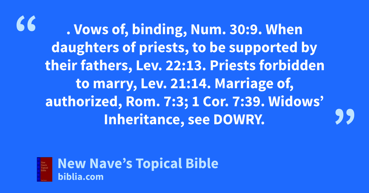 WIDOW. Vows of, binding, Num. 30:9. When daughters of priests, to be supported by their fathers, Lev. 22:13. Priests forbidden to marry, Lev. 21:14. Marriage of, authorized, Rom. 7:3; 1 Cor. 7:39. Widows’ Inheritance, see Dowry.