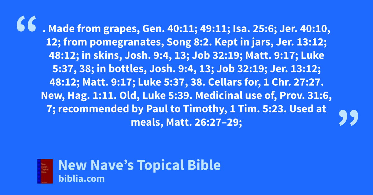 WINE. Made from grapes, Gen. 40:11; 49:11; Isa. 25:6; Jer. 40:10, 12; from pomegranates, Song 8:2. Kept in jars, Jer. 13:12; 48:12; in skins, Josh. 9:4, 13; Job 32:19; Matt. 9:17; Luke 5:37, 38; in bottles, Josh. 9:4, 13; Job 32:19; Jer. 13:12; 48:12; Matt. 9:17; Luke 5:37, 38. Cellars for, 1 Chr. 27:27. New, Hag. 1:11. Old, Luke 5:39. Medicinal use of, Prov. 31:6, 7; recommended by Paul to Timothy, 1 Tim. 5:23. Used at meals, Matt. 26:27–29; Mark 14:23. Made by Jesus at the marriage feast in Cana, John 2:9, 10. Ceremonial use of, Matt. 26:27–29; Luke 22:17–20. Forbidden to priests while on duty, Lev. 10:9; Ezek. 44:21; to Nazirites, Num. 6:2, 3; see Nazirite. Abstinence from, of Daniel, Dan. 1:5, 8, 16; 10:3; of courtiers of Ahasuerus, Esth. 1:8; of Timothy, 1 Tim. 5:23. Samson’s mother forbidden to drink, Judg. 13:4, 5. Forbidden to kings, Prov. 31:4. Denied to the Israelites in the wilderness, that they might know that the Lord was their God, Deut. 29:6. Offered with sacrifices, Ex. 29:40; Lev. 23:13; Num. 15:5, 10; 28:7, 14. Given by Melchizedek to Abraham, Gen. 14:18. Fermented, Lev. 10:9; Num. 6:3; 28:7; Deut. 14:26; 29:6; Prov. 23:31, 32; Mark 2:22. Refined, Isa. 25:6; Jer. 48:11. Of staggering, Psa. 60:3. Inflames the eyes, Gen. 49:12. Commerce in, Rev. 18:13. Banquets of, Esth. 5:6. Given to Jesus at the crucifixion, Matt. 27:48; Mark 15:23; Luke 23:36; John 19:29. Intoxication from the use of, Psa. 104:15; Prov. 4:17.