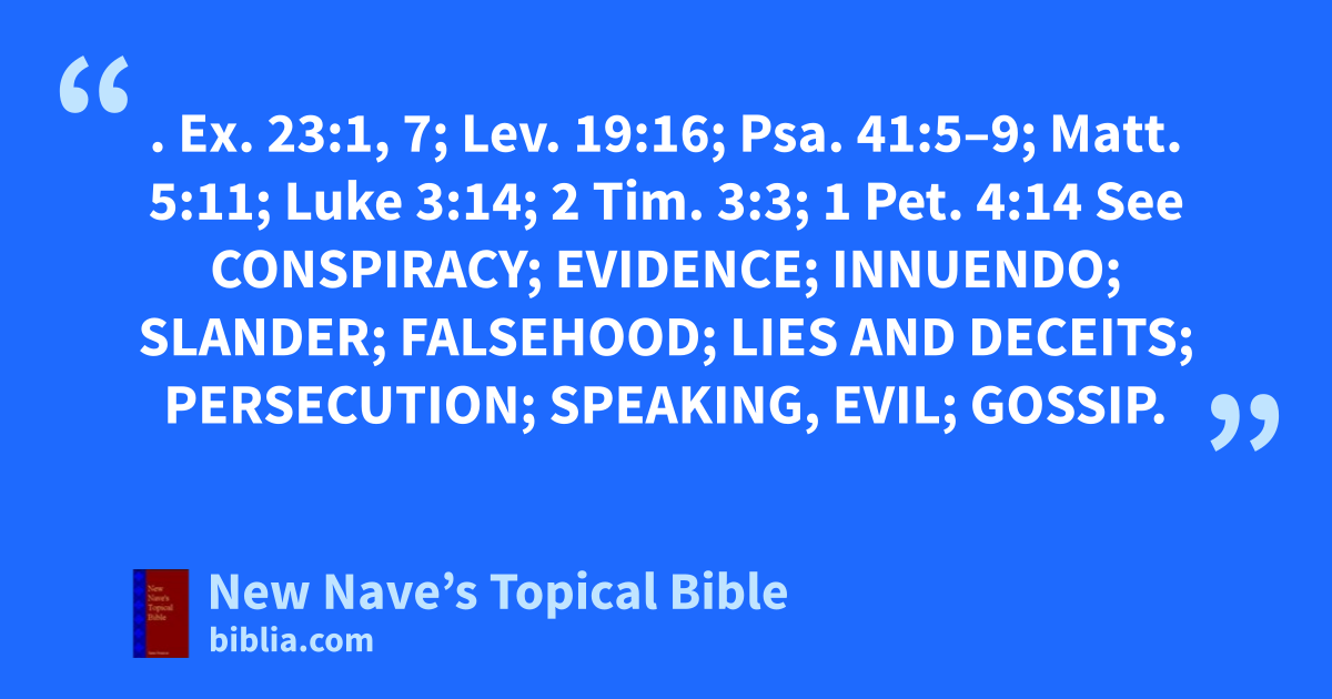 ACCUSATION, FALSE. Ex. 23:1, 7; Lev. 19:16; Psa. 41:5–9; Matt. 5:11; Luke 3:14; 2 Tim. 3:3; 1 Pet. 4:14 See Conspiracy; Evidence; Innuendo; Slander; Falsehood; Lies and Deceits; Persecution; Speaking, Evil; Gossip.