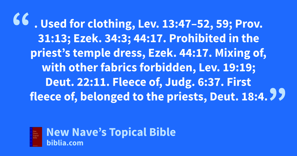 WOOL. Used for clothing, Lev. 13:47–52, 59; Prov. 31:13; Ezek. 34:3; 44:17. Prohibited in the priest’s temple dress, Ezek. 44:17. Mixing of, with other fabrics forbidden, Lev. 19:19; Deut. 22:11. Fleece of, Judg. 6:37. First fleece of, belonged to the priests, Deut. 18:4.