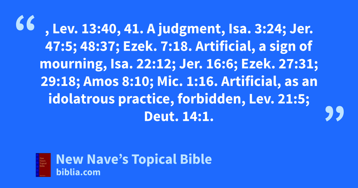 BALDNESS, Lev. 13:40, 41. A judgment, Isa. 3:24; Jer. 47:5; 48:37; Ezek. 7:18. Artificial, a sign of mourning, Isa. 22:12; Jer. 16:6; Ezek. 27:31; 29:18; Amos 8:10; Mic. 1:16. Artificial, as an idolatrous practice, forbidden, Lev. 21:5; Deut. 14:1.