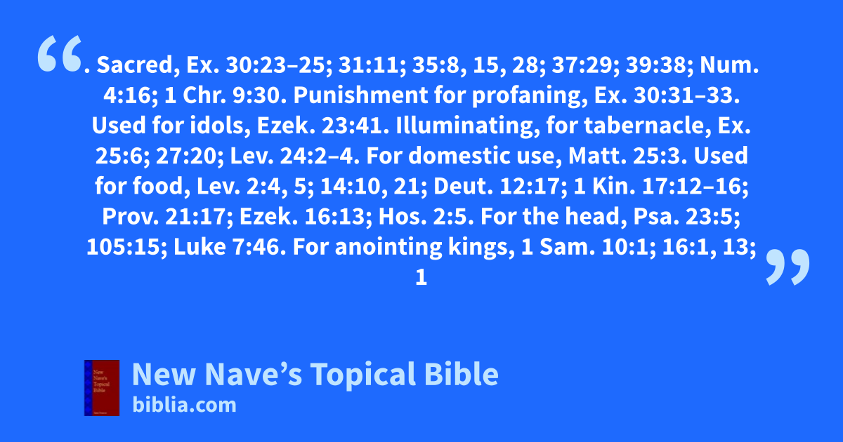 OIL. Sacred, Ex. 30:23–25; 31:11; 35:8, 15, 28; 37:29; 39:38; Num. 4:16; 1 Chr. 9:30. Punishment for profaning, Ex. 30:31–33. Used for idols, Ezek. 23:41. Illuminating, for tabernacle, Ex. 25:6; 27:20; Lev. 24:2–4. For domestic use, Matt. 25:3. Used for food, Lev. 2:4, 5; 14:10, 21; Deut. 12:17; 1 Kin. 17:12–16; Prov. 21:17; Ezek. 16:13; Hos. 2:5. For the head, Psa. 23:5; 105:15; Luke 7:46. For anointing kings, 1 Sam. 10:1; 16:1, 13; 1 Kin. 1:39. Tribute paid in, Hos. 12:1. Commerce in, 2 Kin. 4:1–7. figurative, Job 29:6. See Anointing; Ointment.