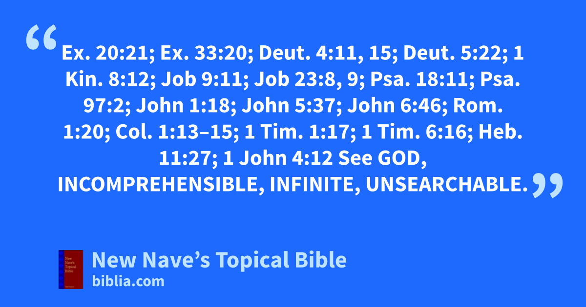 Invisible: Ex. 20:21; Ex. 33:20; Deut. 4:11, 15; Deut. 5:22; 1 Kin. 8:12; Job 9:11; Job 23:8, 9; Psa. 18:11; Psa. 97:2; John 1:18; John 5:37; John 6:46; Rom. 1:20; Col. 1:13–15; 1 Tim. 1:17; 1 Tim. 6:16; Heb. 11:27; 1 John 4:12 See God, Incomprehensible, Infinite, Unsearchable.