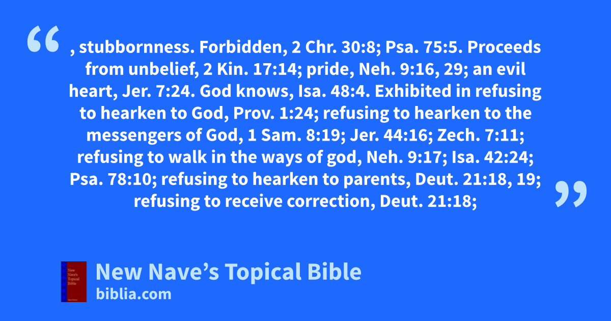 SELF-WILL, stubbornness. Forbidden, 2 Chr. 30:8; Psa. 75:5. Proceeds from unbelief, 2 Kin. 17:14; pride, Neh. 9:16, 29; an evil heart, Jer. 7:24. God knows, Isa. 48:4. Exhibited in refusing to hearken to God, Prov. 1:24; refusing to hearken to the messengers of God, 1 Sam. 8:19; Jer. 44:16; Zech. 7:11; refusing to walk in the ways of god, Neh. 9:17; Isa. 42:24; Psa. 78:10; refusing to hearken to parents, Deut. 21:18, 19; refusing to receive correction, Deut. 21:18; Jer. 5:3; 7:28; rebelling against God, Deut. 31:27; Psa. 78:8; resisting the Holy Spirit, Acts 7:51; walking in the counsels of an evil heart, Jer. 7:24, with Jer. 23:17; hardening the neck, Neh. 9:16; hardening the heart, 2 Chr. 36:13; going backward and not forward, Jer. 7:24; heinousness of, 1 Sam. 15:23. Ministers should be without, Tit. 1:7; warn their people against, Heb. 3:7–12; pray that their people may be forgiven for, Ex. 34:9; Deut. 9:27. Characteristic of the wicked, Prov. 7:11; 2 Pet. 2:10. The wicked cease not from, Judg. 2:19. Punishment for, Deut. 21:21; Prov. 29:1. Illustrated: Psa. 32:9; Jer. 31:18.