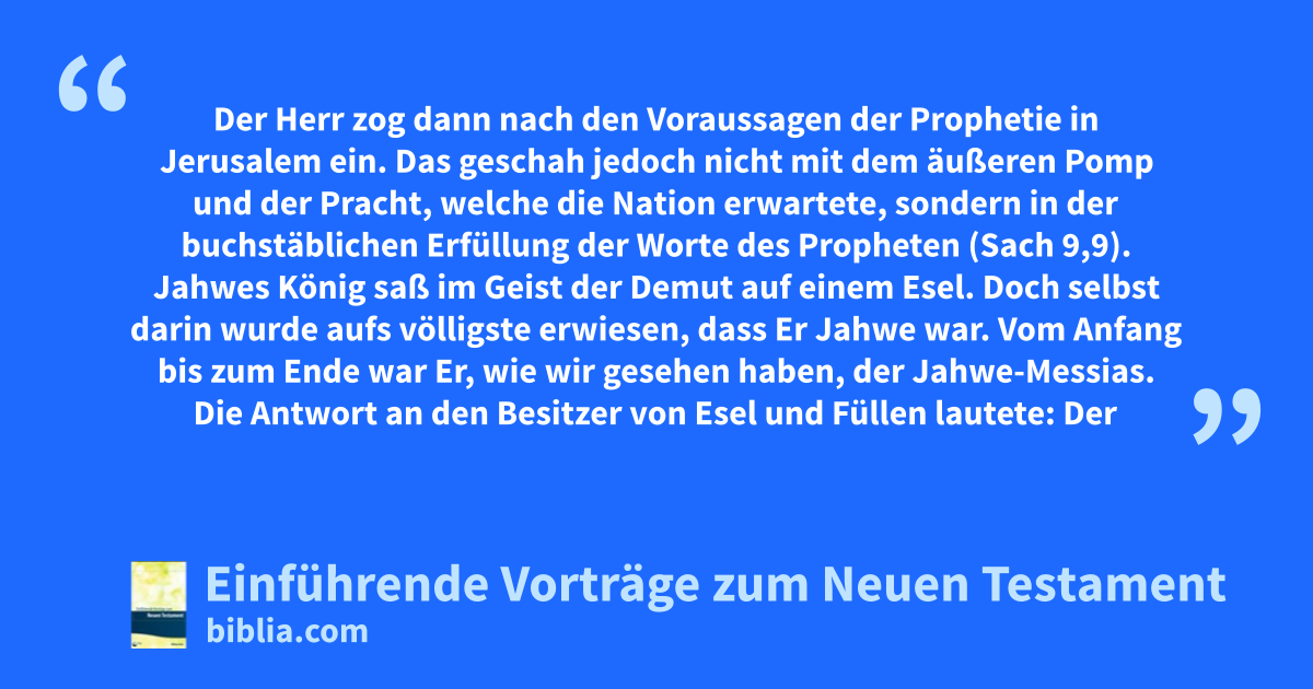 Der Herr zog dann nach den Voraussagen der Prophetie in Jerusalem ein. Das geschah jedoch nicht mit dem äußeren Pomp und der Pracht, welche die Nation erwartete, sondern in der buchstäblichen Erfüllung der Worte des Propheten (Sach 9,9). Jahwes König saß im Geist der Demut auf einem Esel. Doch selbst darin wurde aufs völligste erwiesen, dass Er Jahwe war. Vom Anfang bis zum Ende war Er, wie wir gesehen haben, der Jahwe-Messias. Die Antwort an den Besitzer von Esel und Füllen lautete: Der Herr benötigt sie (V. 3). Dass Jahwe der Heerscharen den Esel beanspruchte, ließ alle Schwierigkeiten verschwinden, obwohl der Unglaube hier seinen Stein des Anstoßes findet. Es war wirklich die Macht des Geistes Gottes, die das Herz des Besitzers beherrschte; denn für Christus gilt: Diesem öffnet der Türhüter (Joh 10,3). Gott vernachlässigte nichts auf irgendeiner Seite und ließ das Herz dieses Israeliten ein Zeugnis davon ablegen, dass die Gnade wirkte trotz der beklagenswerten Kälte, die das Volk betäubte. Welch eine Güte, dass Er ein Zeugnis bewirkte und es an diesem nicht fehlen ließ, selbst auf der Straße nach Jerusalem – ach, der Straße zum Kreuz Christi! Dies aber ist geschehen, damit erfüllt würde, was durch den Propheten geredet ist, der spricht: Sagt der Tochter Zion: Siehe, dein König kommt zu dir, sanftmütig [diese Sanftmut war kennzeichnend für sein damaliges Kommen] und auf einer Eselin reitend, und zwar auf einem Fohlen, einem Jungen des Lasttiers (V. 4–5). Alles musste mit dem Charakter des Nazareners übereinstimmen. Die Jünger gingen hin und taten so, wie Jesus ihnen befohlen hatte. Auch die Volksmenge – es war eine sehr große Volksmenge – wurde beeinflusst. Das war natürlich nur eine vorübergehende Einwirkung, durch welche der Heilige Geist die Herzen bewegte; Gott benutzte sie aber als Zeugnis. Sie blieb nur oberflächlich und war wie eine Welle, die über die Herzen der Menschen hinweg fuhr und dann verschwand. Doch einen Moment lang folgten sie ihr und riefen: Hosanna dem Sohn Davids! Gepriesen sei, der da kommt im Namen des Herrn! Hosanna in der Höhe! (V. 9). Sie riefen dem Herrn die Segenswünsche von Psalm 118 zu.
