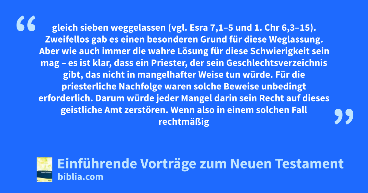 Nehmen wir zum Beispiel Esra! Wenn er sein Geschlechtsverzeichnis als Priester gibt, dann werden nicht nur drei Vorfahren in Folge, sondern gleich sieben weggelassen (vgl. Esra 7,1–5 und 1. Chr 6,3–15). Zweifellos gab es einen besonderen Grund für diese Weglassung. Aber wie auch immer die wahre Lösung für diese Schwierigkeit sein mag – es ist klar, dass ein Priester, der sein Geschlechtsverzeichnis gibt, das nicht in mangelhafter Weise tun würde. Für die priesterliche Nachfolge waren solche Beweise unbedingt erforderlich. Darum würde jeder Mangel darin sein Recht auf dieses geistliche Amt zerstören. Wenn also in einem solchen Fall rechtmäßig eine Auslassung erlaubt war, dann doch wohl auch im Geschlechtsverzeichnis des Herrn. Noch weniger ist der Einwand stichhaltig, wenn wir bedenken, dass diese Auslassung sich nicht auf den Teil der Geschichte bezieht, worüber die Schrift nichts sagt, sondern auf ihr Zentrum, sodass jedes Kind sofort die fehlenden Glieder aufzählen konnte. Offensichtlich beruht die Auslassung daher nicht auf Nachlässigkeit oder Unwissenheit, sondern auf Absicht. Ich zweifle nicht, dass Gott auf diese Weise sein ernstes Urteil über die Verbindung mit Athalja, der Frau Jorams, aus dem gottlosen Haus Ahabs ausdrücken wollte (vgl. V. 8 mit 2. Chr 22–26). Ahasja, Joas und Amazja verschwinden; die Linie erscheint hier erst wieder mit Ussija. Diese Generationen löschte Gott zusammen mit jener gottlosen Frau aus.