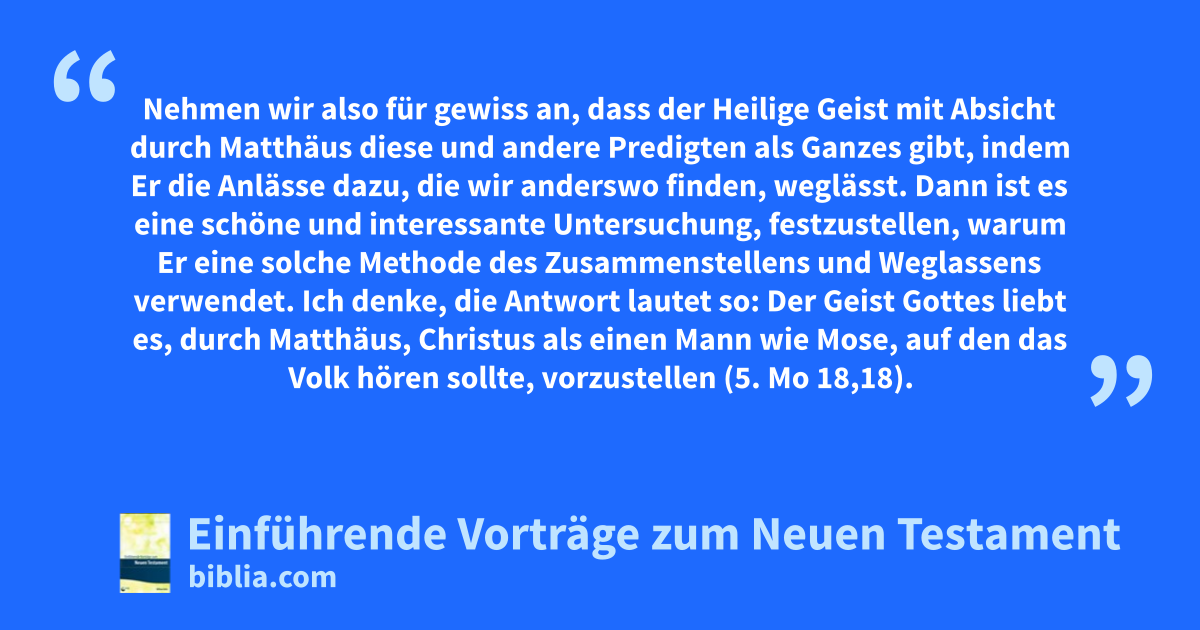 Nehmen wir also für gewiss an, dass der Heilige Geist mit Absicht durch Matthäus diese und andere Predigten als Ganzes gibt, indem Er die Anlässe dazu, die wir anderswo finden, weglässt. Dann ist es eine schöne und interessante Untersuchung, festzustellen, warum Er eine solche Methode des Zusammenstellens und Weglassens verwendet. Ich denke, die Antwort lautet so: Der Geist Gottes liebt es, durch Matthäus, Christus als einen Mann wie Mose, auf den das Volk hören sollte, vorzustellen (5. Mo 18,18). Er präsentiert Jesus nicht nur als einen gesetzgebenden Propheten-König wie Mose, sondern als einen weit Größeren. Denn es wird niemals vergessen, dass der Nazarener der Herr-Gott ist. Deshalb hören wir in dieser Bergpredigt überall den Ton einer Person, die sich bewusst war, dass sie als Gott unter den Menschen weilte. Wenn Jahwe Mose auf die Spitze des einen Berges rief, dann saß der, der damals die zehn Gebote aussprach, jetzt auf einem anderen Berg und lehrte seine Jünger den Charakter des Reiches der Himmel. Die Grundsätze dieses Reiches werden als ein Ganzes eingeführt, indem sie, wie wir gesehen haben, auf die Wirksamkeit seines Dienstes und dessen Folgen eingehen, ohne die Unterbrechungen oder Zusammenhänge zu berücksichtigen. So wie wir seine Wunder sozusagen alle in einen Abschnitt zusammengefasst finden, so ist es hier mit seinen Predigten. Wir sehen also in beiden Fällen den gleichen Grundsatz. Die wesentliche Wahrheit wird uns, ohne die unmittelbaren Anlässe, wie Ereignisse, Bitten usw., zu beachten, vorgestellt. Nach Matthäus wird also das, was der Herr geredet hat, als ein Ganzes gegeben. Dadurch wirkt die Predigt, weil sie nicht unterbrochen wird, umso ernster und majestätischer. Der Geist Gottes drückt hier absichtlich diesen Charakter auf die Rede des Herrn zur, wie ich nicht bezweifle, besonderen Belehrung seines Volkes. Kurz gesagt, erfüllt der Herr hier einen Teil seiner Mission nach Jesaja 53,11, wo sein Werk als ein zweifaches geschildert wird. (…)4