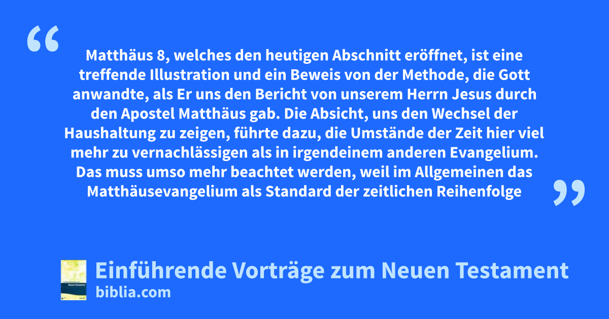 Matthäus 8, welches den heutigen Abschnitt eröffnet, ist eine treffende Illustration und ein Beweis von der Methode, die Gott anwandte, als Er uns den Bericht von unserem Herrn Jesus durch den Apostel Matthäus gab. Die Absicht, uns den Wechsel der Haushaltung zu zeigen, führte dazu, die Umstände der Zeit hier viel mehr zu vernachlässigen als in irgendeinem anderen Evangelium. Das muss umso mehr beachtet werden, weil im Allgemeinen das Matthäusevangelium als Standard der zeitlichen Reihenfolge gilt, außer bei denen, die diese Aufgabe dem Lukasevangelium zuweisen. Nach einem sorgfältigen Vergleich aller Evangelien bin ich zu einem Ergebnis gekommen, das nach jeder unvoreingenommenen Prüfung eigentlich offensichtlich ist, nämlich dass weder Matthäus noch Lukas sich an eine solche Reihenfolge halten. Natürlich halten beide an der chronologischen Reihenfolge fest, wenn es mit der Absicht des Heiligen Geistes bei ihrer Inspiration übereinstimmt. Aber in beiden wird diese zeitliche Folge höheren Gesichtspunkten, die Gott im Auge hatte, untergeordnet. Wenn wir, zum Beispiel, die Begebenheiten des achten Kapitels mit den entsprechenden Ereignissen, soweit sie dort beschrieben sind, im Markusevangelium vergleichen, so erkennen wir, das letzteres uns genaue Zeitangaben gibt. Dies überzeugt mich davon, dass Markus an der zeitlichen Ordnung festhält. Die Absicht des Heiligen Geistes fordert es; und so verlässt er nicht die zeitliche Reihenfolge. Es erhebt sich die berechtigte Frage: Warum lässt der Geist Gottes in diesem und auch im folgenden Kapitel die Frage der Zeit so völlig außer Betracht? Dieselbe Missachtung der bloßen Reihenfolge von Ereignissen finden wir gelegentlich auch in anderen Abschnitten unseres Evangeliums. Doch ich beschäftige mich absichtlich schon im achten Kapitel damit, weil wir diese Achtlosigkeit hier überall finden, so dass der Beweis davon leicht zu führen ist.
