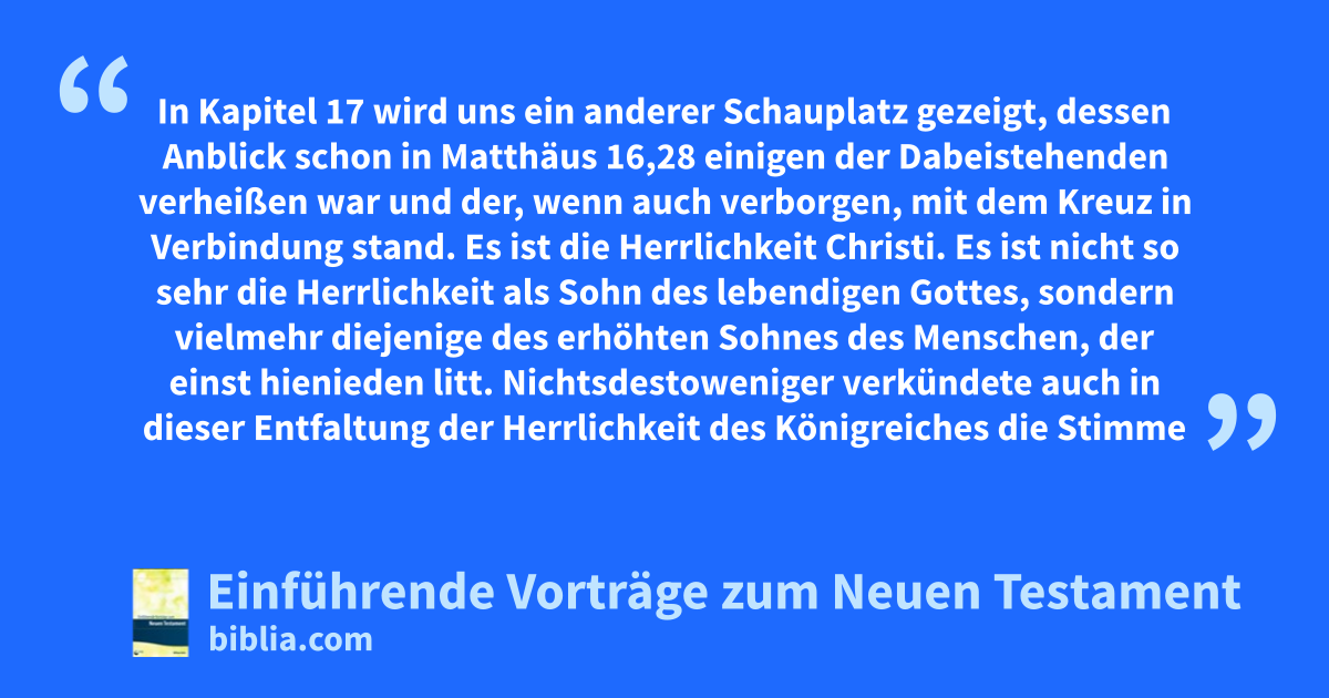 In Kapitel 17 wird uns ein anderer Schauplatz gezeigt, dessen Anblick schon in Matthäus 16,28 einigen der Dabeistehenden verheißen war und der, wenn auch verborgen, mit dem Kreuz in Verbindung stand. Es ist die Herrlichkeit Christi. Es ist nicht so sehr die Herrlichkeit als Sohn des lebendigen Gottes, sondern vielmehr diejenige des erhöhten Sohnes des Menschen, der einst hienieden litt. Nichtsdestoweniger verkündete auch in dieser Entfaltung der Herrlichkeit des Königreiches die Stimme des Vaters Ihn als seinen eigenen Sohn und nicht nur als den verherrlichten Menschen. Es war natürlich das Reich Christi als Mensch, doch Er blieb dabei Gottes eigener Sohn, sein geliebter Sohn, an dem Er Wohlgefallen gefunden hatte. Jetzt sollte man Ihn hören und nicht Moses und Elias, welche verschwinden, um Ihn mit den ausgewählten Zeugen allein zu lassen.