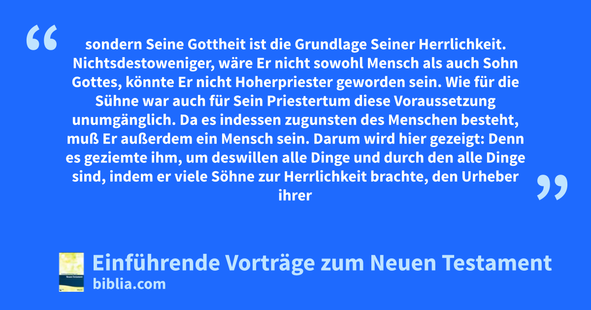 Der Apostel zieht jetzt noch nicht alle Folgerungen. Er legt jedoch in diesen beiden Kapiteln die zweifache Herrlichkeit Christi dar: Er ist Sohn Gottes und Sohn des Menschen. Indem er den letzten Gesichtspunkt weiterverfolgt, nähert er sich den Wesenszügen Christi, die Ihn aufgrund Seines Mitempfindens für den Priesterdienst passend machten. Ich denke nicht, daß Jesus nach den Gedanken Gottes Hoherpriester werden konnte, weil Er Mensch war. Nicht Seine Menschheit, sondern Seine Gottheit ist die Grundlage Seiner Herrlichkeit. Nichtsdestoweniger, wäre Er nicht sowohl Mensch als auch Sohn Gottes, könnte Er nicht Hoherpriester geworden sein. Wie für die Sühne war auch für Sein Priestertum diese Voraussetzung unumgänglich. Da es indessen zugunsten des Menschen besteht, muß Er außerdem ein Mensch sein. Darum wird hier gezeigt: Denn es geziemte ihm, um deswillen alle Dinge und durch den alle Dinge sind, indem er viele Söhne zur Herrlichkeit brachte, den Urheber ihrer Errettung durch Leiden vollkommen zu machen. Denn sowohl der, welcher heiligt, als auch die, welche geheiligt werden, sind alle von einem. (V. 10–11). Beachte! Es wird nicht gesagt: Sind alle eins. Diese Höhe erreicht der Hebräerbrief nirgends. Nirgendwo finden wir hier den Leib, noch weniger die Einheit. Den Leib müssen wir in anderen Paulusbriefen suchen, obwohl wir die Einheit in anderer Gestalt auch bei Johannes finden. Doch der Hebräerbrief geht an keiner Stelle so weit. Er beschäftigt sich mit dem, was für die Empfänger noch bedeutsamer war und auch, möchte ich hinzufügen, für uns von höchst möglicher Wichtigkeit ist. Denn alle, welche meinen, Gott entsprechend auf der Grundlage des Epheserbriefes und der Briefe des Johannes leben zu können ohne die Lehre des Hebräerbriefes, machen einen traurigen Fehler.