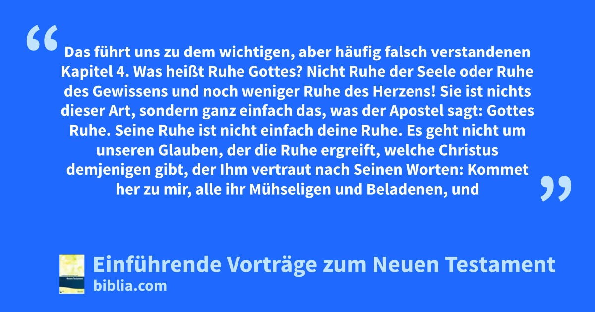 Das führt uns zu dem wichtigen, aber häufig falsch verstandenen Kapitel 4. Was heißt Ruhe Gottes? Nicht Ruhe der Seele oder Ruhe des Gewissens und noch weniger Ruhe des Herzens! Sie ist nichts dieser Art, sondern ganz einfach das, was der Apostel sagt: Gottes Ruhe. Seine Ruhe ist nicht einfach deine Ruhe. Es geht nicht um unseren Glauben, der die Ruhe ergreift, welche Christus demjenigen gibt, der Ihm vertraut nach Seinen Worten: Kommet her zu mir, alle ihr Mühseligen und Beladenen, und ich werde euch Ruhe geben. (Mt 11,28). Er sagt nämlich nicht: Ich werde euch Gottes Ruhe geben. Dazu war die Zeit noch nicht da; und diese Ruhe ist außerdem von einem ganz anderen Charakter. Gottes Ruhe ist die Ruhe Seiner eigenen Genugtuung. Seine Ruhe ist eine Verwandlung dieses ganzen gegenwärtigen Schauplatzes der Prüfung und des Kampfes – der Folgen der Sünde. Natürlich muß das Volk Gottes für jenen zukünftigen Schauplatz zubereitet werden sowie auch der Schauplatz für sie. Die Erlösten sind für Gott unvergleichlich wichtiger als der Bereich, den sie ausfüllen werden.