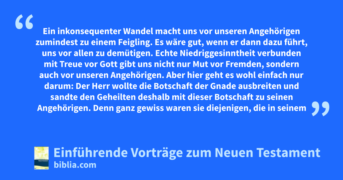 Beachten wir es gut, liebe Geschwister! Wir vergessen leicht diesen ausdrücklichen Befehl. Es heißt nicht: Gehe hin zur Welt! oder: Gehe hin zu aller Schöpfung!, sondern: Gehe hin nach deinem Hause zu den Deinigen! Wie kommt es, dass man oft soviel Schwierigkeiten hat, zu seinen Angehörigen zu reden? Warum sind manche, die vor Fremden so kühn auftreten, so schüchtern vor ihren Hausgenossen, Verwandten und Freunden? Diese Vorbehalte reden oft eine Sprache, die wir wohl beachten sollten. Wir schrecken vor den Vergleichen zurück, die unsere Angehörigen so leicht und mit Bestimmtheit machen werden. Sie prüfen unsere Worte, wie klar, gut und lieblich sie auch sein mögen, daran, was sie in so reichem Maß in unserem täglichen Leben feststellen können. Ein inkonsequenter Wandel macht uns vor unseren Angehörigen zumindest zu einem Feigling. Es wäre gut, wenn er dann dazu führt, uns vor allen zu demütigen. Echte Niedriggesinntheit verbunden mit Treue vor Gott gibt uns nicht nur Mut vor Fremden, sondern auch vor unseren Angehörigen. Aber hier geht es wohl einfach nur darum: Der Herr wollte die Botschaft der Gnade ausbreiten und sandte den Geheilten deshalb mit dieser Botschaft zu seinen Angehörigen. Denn ganz gewiss waren sie diejenigen, die in seinem Fall die schreckliche und schamlos erniedrigende Macht Satans am besten kennengelernt hatten. Seine Vertrauten waren natürlich am stärksten von seinem Schicksal betroffen; und deshalb gab es, ohne Zweifel, gute Gründe für diese Sendung. Es ist auch für uns gut, dies im Gedächtnis zu behalten. Es heißt nicht, dass ein Erretteter nur zu seinen Angehörigen gehen soll. Aber es bleibt immer wahr und richtig, dass das Geheimnis der Gnade in unseren Herzen uns zu unseren Angehörigen schickt, damit jene, welche unsere Torheiten und Sünden kennen, alles erfahren und von dem mächtigen Heiland hören, den wir gefunden haben. Gehe hin nach deinem Hause zu den Deinigen und verkünde ihnen, wie viel der Herr an dir getan, und wie er sich deiner erbarmt hat. Und er ging hin und fing an, in der Dekapolis auszurufen, wie viel Jesus an ihm getan hatte.