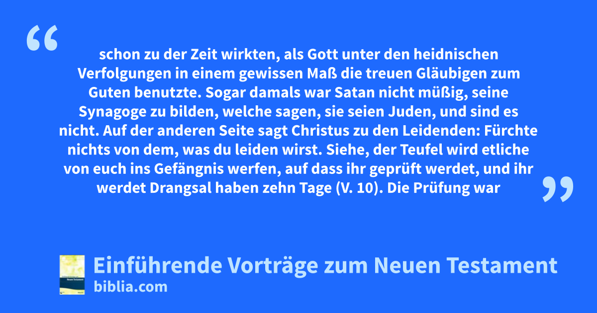 Im Schreiben an den Engel der Versammlung in Smyrna treffen wir auf einen ganz anderen Zustand. Dem Wesen nach handelt es sich um einen besonderen Fall im Unterschied zu dem allgemeinen, den wir schon gesehen haben. Dem Herrn gefiel es, nach dem Abweichen von der apostolischen Reinheit und vor allem von der ersten Liebe Trübsal zu bringen. Er erlaubte alle Arten von Prüfungen über sein Volk, indem Er der Macht Satans Freiheit gab, welche durch heidnische Verfolger wirkte. Das ist, wie wir sehen, der Anlass zum Brief an die Versammlung in Smyrna. Dieses sagt der Erste und der Letzte, der starb und wieder lebendig wurde: Ich kenne deine Drangsal und deine Armut (du bist aber reich) und die Lästerung von denen, welche sagen, sie seien Juden, und sind es nicht, sondern eine Synagoge des Satans (V. 8–9).