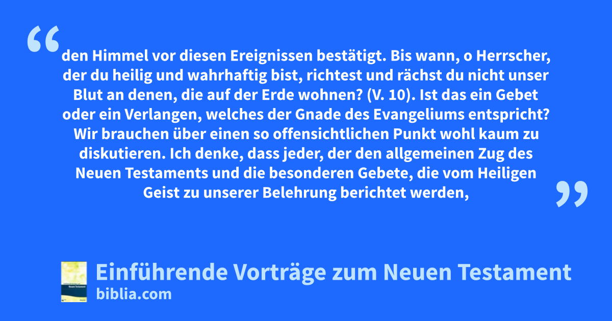 Stimmt das nicht genau mit dem überein, was wir schon nachwiesen, nämlich dass die himmlischen, verherrlichten Erlösten diesen Schauplatz verlassen haben und dass Gott tätig ist, um ein neues Zeugnis zu bilden? Dieses wird natürlich seine besonderen Eigenheiten haben. (Damit sollen selbstverständlich nicht die Wirklichkeiten des Neuen Testaments ausgelöscht werden). Denn gleichzeitig werden die Seelen der Erlösten ganz besonders in das hineingeführt, was zu alten Zeiten geoffenbart worden war. Gott wollte jetzt das erfüllen, was damals vorausgesagt wurde. Die Zeit nahte für Gott heran, die Erde zu übernehmen. Das große Thema des Alten Testaments ist die Erde, wie sie unter der Herrschaft des Himmels gesegnet wird, während Christus Haupt von beidem ist. Die Erde, das irdische Volk Israel und die Nationen werden sich dann der Tage des Himmels hienieden erfreuen. Folglich zeigen uns die erwähnten Seelen [unter dem Altar; Übs.] diesen Zustand und seine Hoffnungen. Sie bitten um irdische Gerichte. Sie wünschen nicht, dass ihre Feinde bekehrt werden, sondern dass Gott ihr Blut an jenen räche. Nichts könnte einfacher oder sicherer sein als diese Folgerung. Und es wurde ihnen … gesagt, dass sie noch eine kleine Zeit ruhen sollten, bis auch ihre Mitknechte und ihre Brüder vollendet sein würden, die ebenso wie sie getötet werden würden (V. 11).
