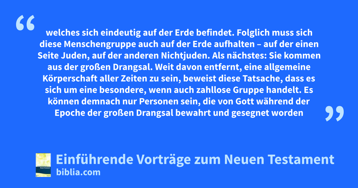 In diesem Fall ist für mich vollkommen klar, dass sie sich nicht im Himmel als solchen aufhalten. Es gibt gewichtige Einwände. Zuerst finden wir sie in einem ausdrücklichen Gegensatz zu Israel, welches sich eindeutig auf der Erde befindet. Folglich muss sich diese Menschengruppe auch auf der Erde aufhalten – auf der einen Seite Juden, auf der anderen Nichtjuden. Als nächstes: Sie kommen aus der großen Drangsal. Weit davon entfernt, eine allgemeine Körperschaft aller Zeiten zu sein, beweist diese Tatsache, dass es sich um eine besondere, wenn auch zahllose Gruppe handelt. Es können demnach nur Personen sein, die von Gott während der Epoche der großen Drangsal bewahrt und gesegnet worden sind.