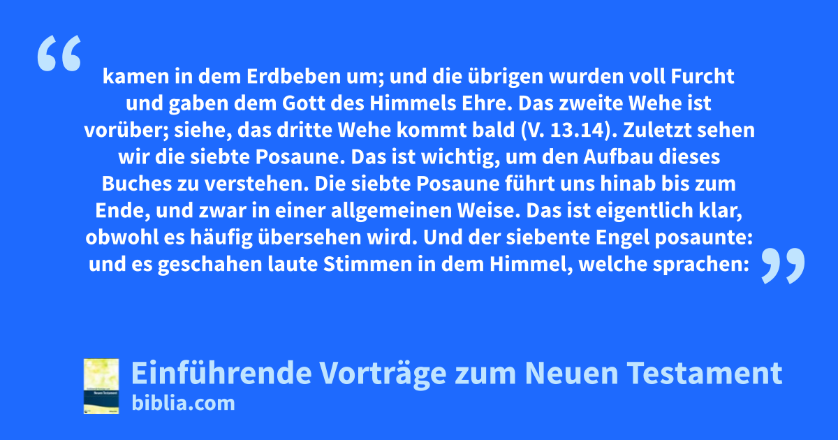 Zuletzt sehen wir die siebte Posaune. Das ist wichtig, um den Aufbau dieses Buches zu verstehen. Die siebte Posaune führt uns hinab bis zum Ende, und zwar in einer allgemeinen Weise. Das ist eigentlich klar, obwohl es häufig übersehen wird. Und der siebente Engel posaunte: und es geschahen laute Stimmen in dem Himmel, welche sprachen: Das Reich der Welt unseres Herrn und seines Christus ist gekommen (V. 15). Etwas genauer übersetzt müsste es eigentlich heißen: Das Welt-Königreich unseres Herrn und seines Christus ist gekommen, wenn unsere Zunge eine solche Wortverbindung gestattet. Es geht nicht einfach um Macht im Allgemeinen, die im Himmel übertragen wurde, sondern: Das Reich der Welt unseres Herrn und seines Christus ist gekommen, und er wird herrschen von Ewigkeit zu Ewigkeit. Und die vierundzwanzig Ältesten, die vor Gott auf ihren Thronen sitzen, fielen auf ihre Angesichter und beteten Gott an und sprachen: Wir danken dir, Herr, Gott, Allmächtiger, der da ist und der da war, dass du deine große Macht angenommen und die Herrschaft angetreten hast! Und die Nationen sind zornig geworden, und dein Zorn ist gekommen und die Zeit der Toten, gerichtet zu werden, und den Lohn zu geben deinen Knechten, den Propheten, und den Heiligen und denen, die deinen Namen fürchten, die Kleinen und die Großen, und die zu verderben, die die Erde verderben (V. 15–18).