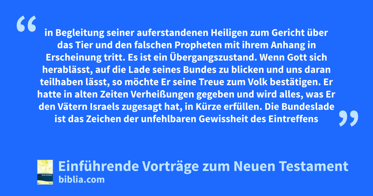 So wird jetzt der Tempel Gottes offen gesehen. Nicht eine Tür in den Himmel wird geöffnet, um uns einen allgemeinen Blick von dem zu geben, was nach den Gedanken Gottes auf der Erde geschehen soll! (vgl. Off 4,1). Das hatte Johannes schon gesehen. Der allgemeine Ausblick ist jetzt zu Ende. Wir betreten nun eine eingeschränktere Abfolge von Ereignissen. Der Tempel Gottes im Himmel wird geöffnet; und dort wird in seinem Tempel die Lade seines Bundes gesehen. Das bedeutet demnach die Wiederaufnahme der alten Beziehungen zu Gottes altem Volk Israel. Gleichwohl handelt es sich noch nicht um den Tag des Segens für die Juden. Auch wird nicht der Himmel selbst geöffnet, damit Jesus in Begleitung seiner auferstandenen Heiligen zum Gericht über das Tier und den falschen Propheten mit ihrem Anhang in Erscheinung tritt. Es ist ein Übergangszustand. Wenn Gott sich herablässt, auf die Lade seines Bundes zu blicken und uns daran teilhaben lässt, so möchte Er seine Treue zum Volk bestätigen. Er hatte in alten Zeiten Verheißungen gegeben und wird alles, was Er den Vätern Israels zugesagt hat, in Kürze erfüllen. Die Bundeslade ist das Zeichen der unfehlbaren Gewissheit des Eintreffens dessen, zu dem Er sich verpflichtet hatte.