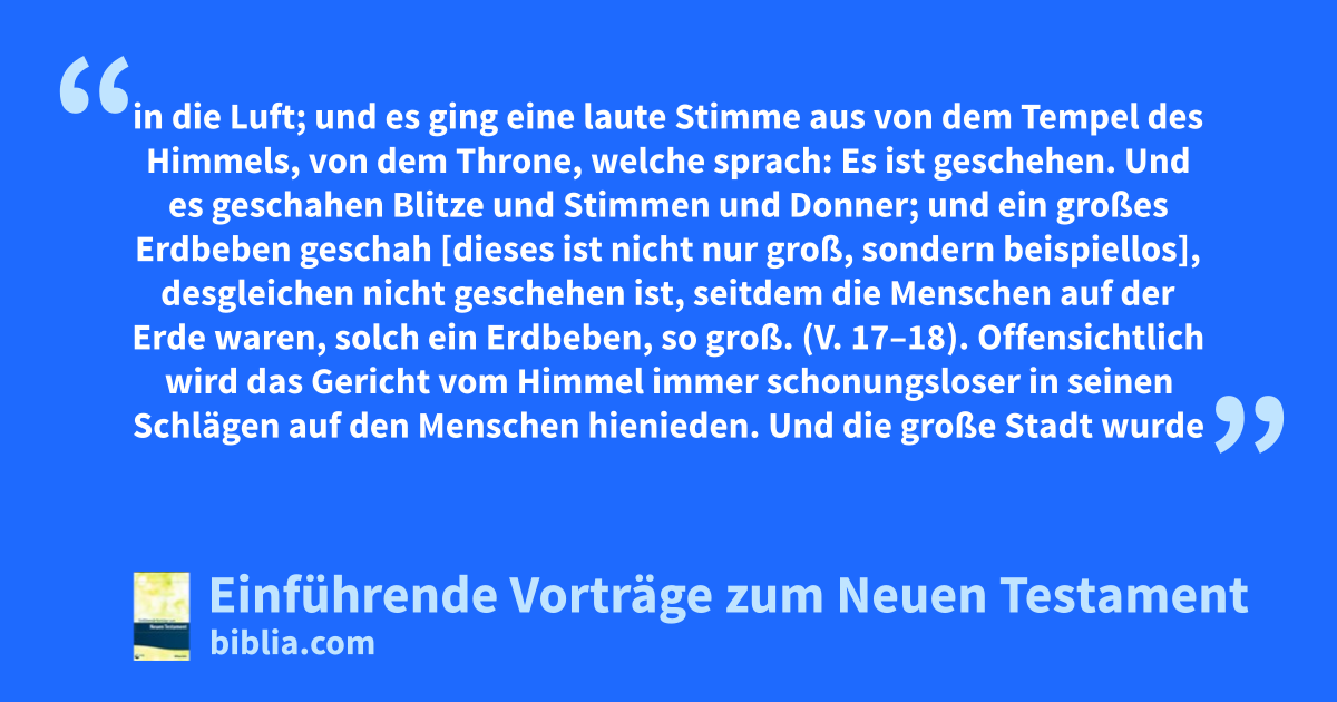 Zuletzt kommt der siebte Engel, der sich mit der Welt noch entschlossener und umfassender beschäftigen wird, indem er seine Schale auf die Luft ausgießt. Und der siebente goß seine Schale aus in die Luft; und es ging eine laute Stimme aus von dem Tempel des Himmels, von dem Throne, welche sprach: Es ist geschehen. Und es geschahen Blitze und Stimmen und Donner; und ein großes Erdbeben geschah [dieses ist nicht nur groß, sondern beispiellos], desgleichen nicht geschehen ist, seitdem die Menschen auf der Erde waren, solch ein Erdbeben, so groß. (V. 17–18). Offensichtlich wird das Gericht vom Himmel immer schonungsloser in seinen Schlägen auf den Menschen hienieden. Und die große Stadt wurde (ἐγὲνετο) in drei Teile geteilt, und die Städte der Nationen fielen, und die große Babylon kam ins Gedächtnis vor Gott. (V. 19). Das erklärt die Warnung vor dem Fall Babylons, auf den sich in der vollständigen Serie der Handlungsweisen Gottes in Kapitel 14 bezogen wird. Bis zu diesem Zeitpunkt führt uns Offenbarung 16.