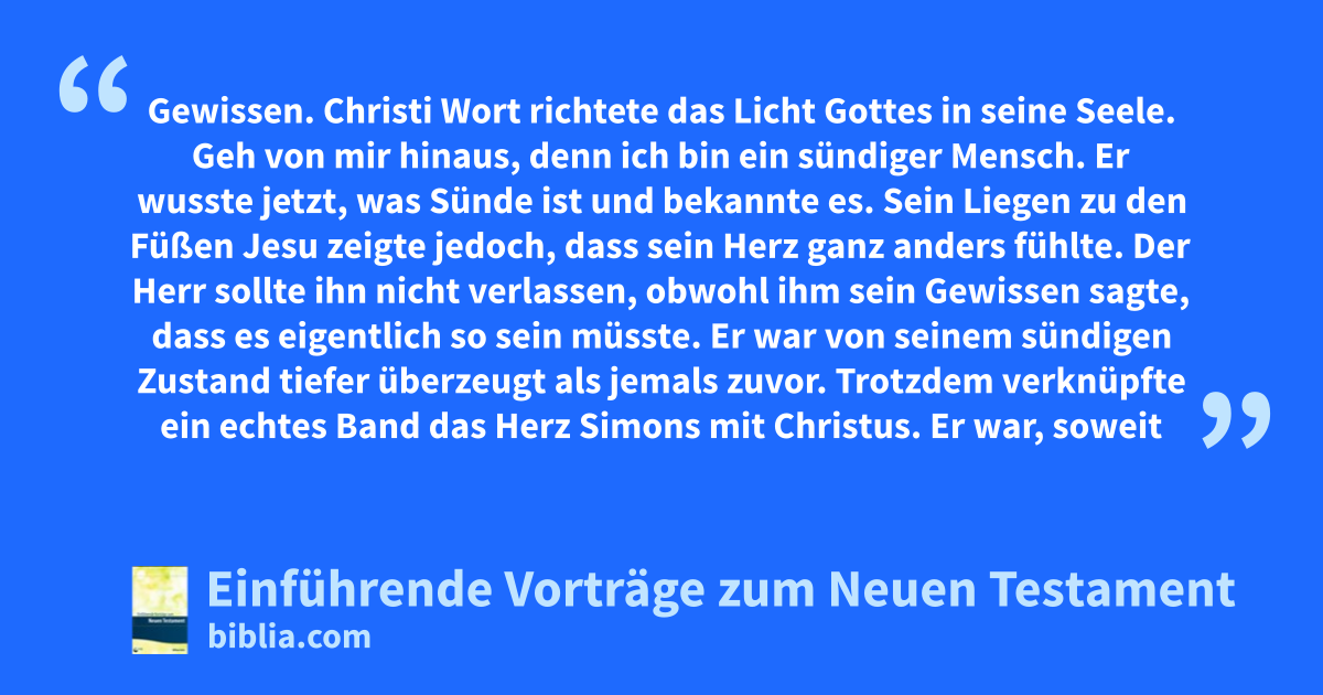 Es geschah aber, als die Volksmenge auf ihn andrängte, um das Wort Gottes zu hören, dass er an dem See Genezareth stand. Und er sah zwei Schiffe am See stehen; die Fischer aber waren aus denselben getreten und wuschen ihre Netze. Er aber stieg in eines der Schiffe, welches Simon gehörte, und bat ihn, ein wenig vom Lande hinauszufahren; und er setzte sich und lehrte die Volksmengen vom Schiffe aus. Als er aber aufhörte zu reden, sprach er zu Simon: Fahre hinaus auf die Tiefe und lasset eure Netze zu einem Fange hinab. Und Simon antwortete und sprach zu ihm: Meister, wir haben uns die ganze Nacht hindurch bemüht und nichts gefangen, aber auf dein Wort will ich das Netz hinablassen (V. 1–5). Offensichtlich bestand die erste große Probe im Wort Jesu. Simon hatte sich lange abgemüht; doch das Wort Jesu war genug. Und als sie dies getan hatten, umschlossen sie eine große Menge Fische, und ihr Netz riss. Und sie winkten ihren Genossen in dem anderen Schiffe, dass sie kämen und ihnen hülfen; und sie kamen, und sie füllten beide Schiffe, so dass sie sanken (V. 6–7). Danach lesen wir von der sittlichen Wirkung. Als aber Simon Petrus es sah, fiel er zu den Knien Jesu nieder und sprach: Geh von mir hinaus, denn ich bin ein sündiger Mensch, Herr (V. 8). Das war die natürlichste Reaktion für eine Seele, die nicht nur durch die mächtige Tat des Herrn getroffen war, sondern vor allem auch durch den Beweis, dass man seinem Wort unbedingt vertrauen konnte und dass die göttliche Macht das Wort des Menschen Christus Jesus beantwortete. Seine Sündhaftigkeit stand groß vor Simons Gewissen. Christi Wort richtete das Licht Gottes in seine Seele. Geh von mir hinaus, denn ich bin ein sündiger Mensch. Er wusste jetzt, was Sünde ist und bekannte es. Sein Liegen zu den Füßen Jesu zeigte jedoch, dass sein Herz ganz anders fühlte. Der Herr sollte ihn nicht verlassen, obwohl ihm sein Gewissen sagte, dass es eigentlich so sein müsste. Er war von seinem sündigen Zustand tiefer überzeugt als jemals zuvor. Trotzdem verknüpfte ein echtes Band das Herz Simons mit Christus. Er war, soweit wir das beurteilen können, aus Gott geboren und kannte die Stimme Jesu seit einiger Zeit. Er hörte sie nicht zum ersten Mal, wie wir von Johannes erfahren. Jetzt durchdrang ihn das Wort indessen so heftig und erforschend, dass jene Äußerung die Gefühle seiner Seele wiedergab. Dennoch lag zweifellos ein Widerspruch darin, sich den Füßen Jesu zu nahen und dabei zu sagen: Geh von mir hinaus. Dieser Zwiespalt hatte seine Wurzel nicht im Herzen; er lag nur an der Oberfläche seiner Worte. Denn seine innersten Gefühle verlangten nach Jesus und erfreuten sich an Ihm. Er klammerte sich an Ihn mit ganzer Seele und doch in dem festen Bewusstsein, dass er nicht das geringste Recht dazu hatte. Er wusste, dass er sogar in einem gewissen Sinn das Verdammungsurteil über sich aussprechen musste, obwohl das völlig seinen Wünschen widersprach. Je mehr er erkannte, wer Jesus war, desto unwürdiger fühlte er sich für die Gesellschaft einer solchen Person. Die Gnade ruft in ihrer Wirksamkeit dieses Empfinden schon früh in einer Seele hervor. Es ist nach meiner Meinung nicht das erste Ergebnis, wenngleich ein frühes. Wir dürfen nämlich bei den Wegen Gottes in einer Seele nicht zu ungeduldig sein. Petrus wurde durch das Wunder überrascht, darum sprach er diese Worte zum Herrn. Die gnädige Antwort sollte ihn beruhigen. Fürchte dich nicht, sagte Christus, von nun an wirst du Menschen fangen (V. 10). Ich beschäftige mich mit diesem Abschnitt ausführlich, um die sittliche Kraft unseres Evangeliums herauszustellen. Eine göttliche Person offenbarte sich in Gnade, indem sie das Wissen und die Macht Gottes enthüllte. Auch wenn sie sich in sittlicher Hinsicht an das Gewissen wandte, trieb sie nichtsdestoweniger die Furcht aus.
