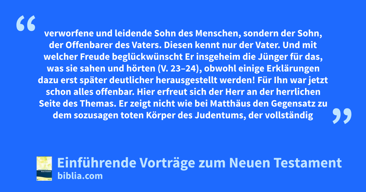 Wir stellen fest, dass diese Worte hier nicht wie im Matthäusevangelium (Kap. 11) mit dem Abbruch der Beziehungen zum Judentum in Verbindung stehen. Auch blickte Er nicht ausschließlich auf die völlige Vernichtung der Macht Satans durch den Samen des Weibes – durch einen Menschen und für den Menschen. Indem Er noch tiefer in die Wahrheit eindrang als bis zum Königreich, erklärte Er jene Ratschlüsse des Vaters im Sohn, dem alle Dinge übergeben sind und dessen Herrlichkeit für den Menschen unergründlich ist. Darin lag der Schlüssel zu seiner gegenwärtigen Verwerfung und die verborgene und größte Segnung für seine Heiligen. Er ist jetzt nicht so sehr der als Christus verworfene und leidende Sohn des Menschen, sondern der Sohn, der Offenbarer des Vaters. Diesen kennt nur der Vater. Und mit welcher Freude beglückwünscht Er insgeheim die Jünger für das, was sie sahen und hörten (V. 23–24), obwohl einige Erklärungen dazu erst später deutlicher herausgestellt werden! Für Ihn war jetzt schon alles offenbar. Hier erfreut sich der Herr an der herrlichen Seite des Themas. Er zeigt nicht wie bei Matthäus den Gegensatz zu dem sozusagen toten Körper des Judentums, der vollständig gerichtet und verlassen wurde.