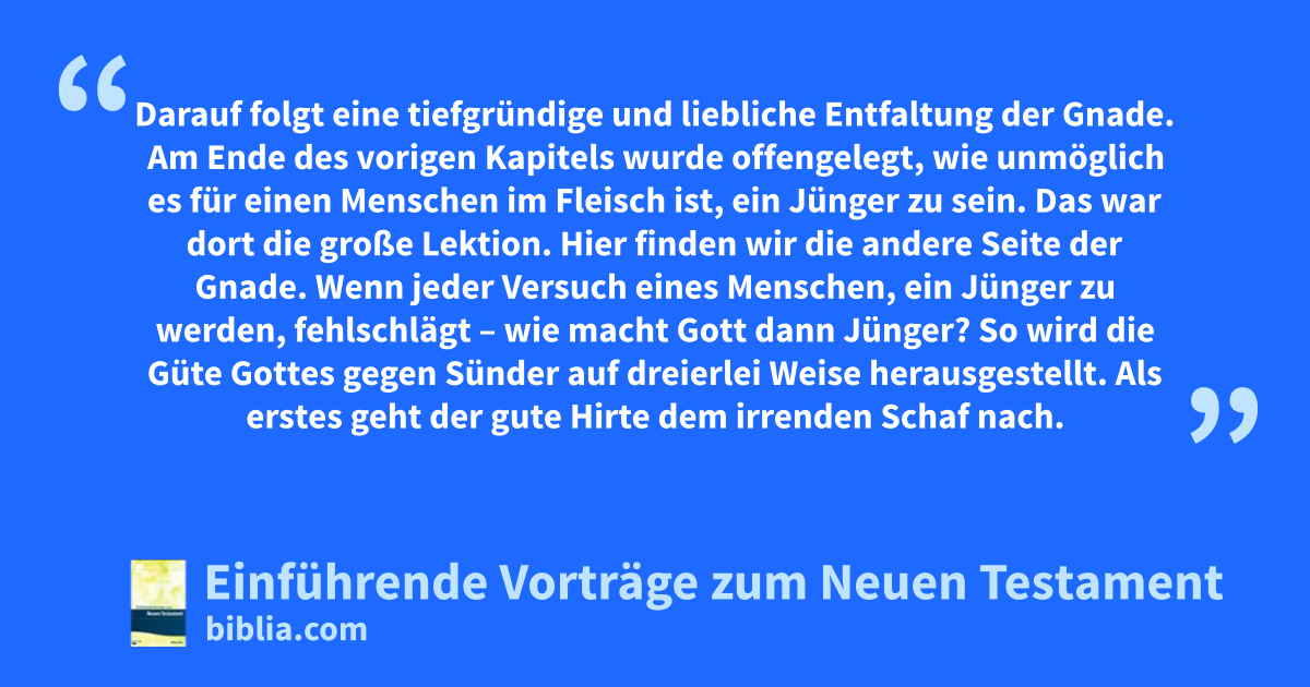 Darauf folgt eine tiefgründige und liebliche Entfaltung der Gnade. Am Ende des vorigen Kapitels wurde offengelegt, wie unmöglich es für einen Menschen im Fleisch ist, ein Jünger zu sein. Das war dort die große Lektion. Hier finden wir die andere Seite der Gnade. Wenn jeder Versuch eines Menschen, ein Jünger zu werden, fehlschlägt – wie macht Gott dann Jünger? So wird die Güte Gottes gegen Sünder auf dreierlei Weise herausgestellt. Als erstes geht der gute Hirte dem irrenden Schaf nach. Das verdeutlicht ganz klar die Gnade, wie sie sich in Christus, dem Sohn des Menschen, zeigte, der gekommen war, um das Verlorene zu suchen und zu erretten.