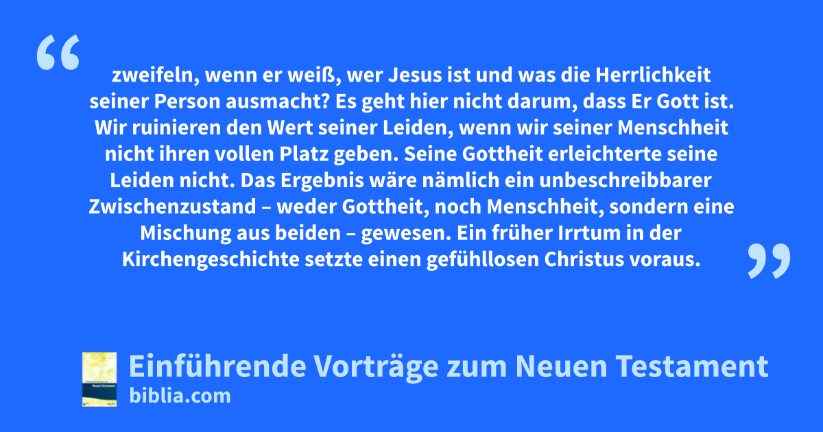Nun war ihre Stunde gekommen und die Gewalt der Finsternis (V. 53). Vorher konnten sie die Hände nicht an Ihn legen. Aber jetzt, nachdem das Werk im Dienst getan und Er endgültig verworfen war, nahm Jesus jede Erniedrigung, Schande und alle Leiden an. Er sah jedoch darin nicht nur die Menschen. Er blickte nicht auf den Teufel, die Juden oder die Heiden. Er fühlte alles, was die Menschen taten und sagten, und anerkannte darin seinen Vater. Er wusste sehr gut, dass sein Vater jeden Schlag, wenn es Ihm gefallen hätte, verhindern konnte. Er hätte Israels Herz verwandeln und die Nichtjuden vernichten können. Stattdessen darf der Jude Ihn jetzt ungehindert hassen, der Nichtjude verachten und kreuzigen. Sowohl Herodes als auch Pontius Pilatus mit den Nationen und dem Volk Israel waren versammelt gegen den heiligen Knecht Jesus, den Gott gesalbt hatte. Geschah es indessen nicht zu dem Zweck, alles zu tun, was Gottes Hand und Ratschluss zuvorbestimmt hatte (Apg 4,27–28)? Er sah Gott, seinen Vater, über und hinter all jenen zweitrangigen Werkzeugen und beugte sich und danksagte, während Er mit Blutschweiß betete. Er wollte zu seinem Schutz keine Barrikade an Wundern aufrichten. Wenn wir solche Umstände, wie sie damals Jesus umgaben, vor Gott erwägen – wenn Jesus das, was kommen sollte, in Gottes Gegenwart voraussah, dann wurde die Schwere von allem nicht verringert, sondern vielmehr vergrößert. So sehen wir Ihn hier, wie Er ernstlich zu seinem Vater betete, dass, wenn es möglich wäre, der Kelch an Ihm vorübergehe. Es war jedoch nicht möglich, darum fügte Er hinzu: Doch nicht mein Wille, sondern der deine geschehe! (V. 42). Beides war vollkommen. Es wäre Härte und nicht Liebe gewesen, hätte Er den Kelch als etwas Leichtes genommen. Das konnte bei Jesus niemals der Fall sein. Es war gerade ein Teil seiner Vollkommenheit, dass Er den schrecklichen Kelch fühlte und verabscheute. Denn was war in dem Kelch? Der Zorn Gottes! Wie konnte Er sich den Zorn Gottes wünschen? Er musste ihn verabscheuen. Doch es entsprach dem Wesen Jesu, trotzdem zu sagen: Dein Wille geschehe! Sowohl das Verabscheuen als auch die Annahme waren ganz und gar vollkommen; beide waren in gleicher Weise an ihrem Platz und zu ihrer Zeit richtig. Wer vermag, das nicht zu sehen oder daran zu zweifeln, wenn er weiß, wer Jesus ist und was die Herrlichkeit seiner Person ausmacht? Es geht hier nicht darum, dass Er Gott ist. Wir ruinieren den Wert seiner Leiden, wenn wir seiner Menschheit nicht ihren vollen Platz geben. Seine Gottheit erleichterte seine Leiden nicht. Das Ergebnis wäre nämlich ein unbeschreibbarer Zwischenzustand – weder Gottheit, noch Menschheit, sondern eine Mischung aus beiden – gewesen. Ein früher Irrtum in der Kirchengeschichte setzte einen gefühllosen Christus voraus. Keine Erdichtung gegen die Wahrheit ist schlimmer als diese, außer der Lüge, welche leugnet, dass Er Gott der Sohn ist. Ein leiden- und gefühlloser Christus ist von Satan und nicht der wahrhaftige Gott und das ewige Leben (1. Joh 5,20). Er ist ein Hirngespinst des Feindes. Seid versichert: Wenn die Leiden so echt und für Gott so kostbar sind, dann ist es gefährlich, irgendein Teil davon wegzuschneiden, aufzulösen oder zu leugnen. Für uns ist wichtig, was Gott uns in seinem Wort über die Leiden Christi mitteilt, und nicht, ob wir alles verstehen, was Er darüber sagt. Denkt daran: Wir erkennen nur stückweise und müssen viel lernen, vor allem bezüglich dessen, was nicht unsere unmittelbaren Bedürfnisse betrifft. Doch für eines sind wir immer verantwortlich, nämlich dass wir uns Gott unterwerfen und Ihm glauben, auch wenn wir nur wenig in die Tiefen alles dessen eindringen, was Er uns über Jesus aufgeschrieben hat.