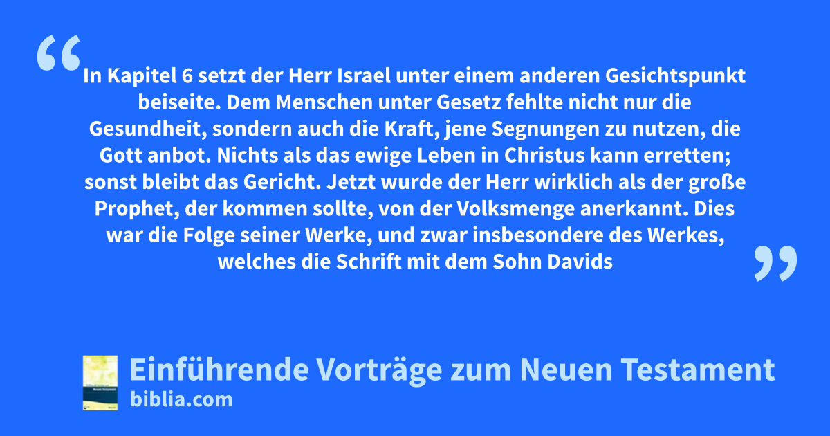 In Kapitel 6 setzt der Herr Israel unter einem anderen Gesichtspunkt beiseite. Dem Menschen unter Gesetz fehlte nicht nur die Gesundheit, sondern auch die Kraft, jene Segnungen zu nutzen, die Gott anbot. Nichts als das ewige Leben in Christus kann erretten; sonst bleibt das Gericht. Jetzt wurde der Herr wirklich als der große Prophet, der kommen sollte, von der Volksmenge anerkannt. Dies war die Folge seiner Werke, und zwar insbesondere des Werkes, welches die Schrift mit dem Sohn Davids in Verbindung bringt (Ps 132). Daraufhin wollten sie Ihn zum König machen. Das schien ganz natürlich zu sein. Er hatte die Armen mit Brot gesättigt. Warum sollte Er nicht seinen Platz auf dem Thron einnehmen? Der Herr weigerte sich und ging auf den Berg, um zu beten. Seine Jünger waren inzwischen auf dem See einem Sturm ausgesetzt und mühten sich ab, in den ersehnten Hafen zu kommen, bis Er mit ihnen zusammentraf. Unmittelbar danach war das Schiff an dem Land, zu dem sie fuhren (Verse 1–21.).