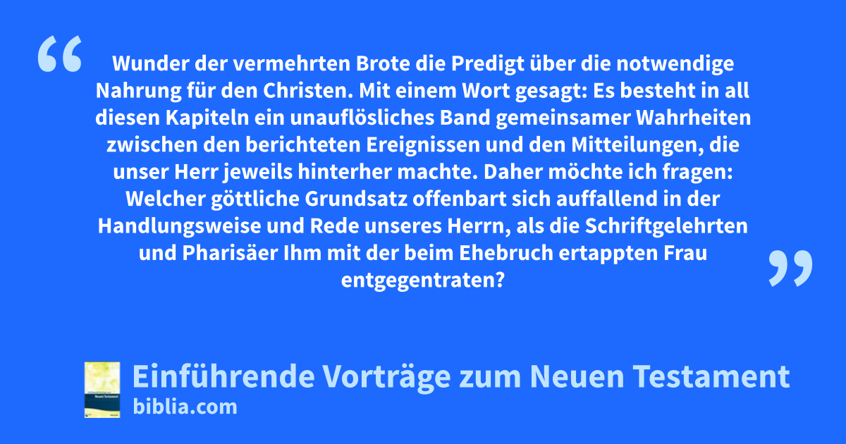 Suche mir aus der ganzen Bibel eine Einführung aus, die so gut zu der Lehre dieses Kapitels passt! Es ist vom Anfang bis zum Ende voll Licht – das Licht Gottes und seines Wortes in der Person Jesu. Sehen wir diese Wahrheit nicht unzweideutig in dem Ereignis am Anfang? Stellt Christus sich nicht gleich danach in seiner Predigt wie fast ständig im Johannesevangelium als das Licht der Welt vor? Er ist in sich selbst Gottes Licht durch sein Wort und steht unendlich über dem Gesetz. Dennoch gibt Er gleichzeitig dem Gesetz seine vollste Autorität. Nur eine göttliche Person konnte auf diese Weise alles an seinen rechten Platz stellen und dort bewahren. Nur eine göttliche Person konnte in vollkommener Gnade handeln und zur gleichen Zeit eine unbefleckte Heiligkeit aufrecht halten, und das umso mehr, als diese Heiligkeit sich in dem befand, der voller Gnade war.