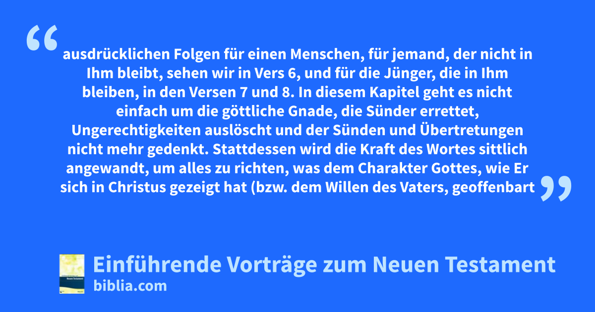 Der Gesichtskreis des Herrn umfasste also nicht nur jene, die Ihn damals umgaben und schon Reben am Weinstock waren, sondern grundsätzlich auch alle, die später folgen würden. Darin sind natürlich solche eingeschlossen, die nur dem Namen nach Israel und alles Übrige um seinetwillen verlassen hatten, obwohl der erste Augenschein Besseres verhieß. Das Aufgeben aller Dinge um seinetwillen war gewiss nicht einfach und hatte ernste Konsequenzen, insbesondere wenn ein Mensch auf diese Weise alles verließ, was seine Zuneigungen und sein Gewissen erfüllte, nämlich seine Religion. Kurz gesagt: Wenn ein Mensch um jeden Preis alles aufgibt und zudem seine größten Feinde unter seinen Hausgenossen findet, dann darf man in seiner Handlung wohl Aufrichtigkeit voraussetzen. Doch diese muss noch erwiesen werden. Der Beweis liegt im Bleiben in Christus. Kein Ausdruck ist für Johannes kennzeichnender als gerade das Wort bleiben, und zwar sowohl in Hinsicht auf die Gnade als auch auf die Regierungswege Gottes. Hier werden die Jünger auf die Probe gestellt. Denn das Christentum ist nicht die Offenbarung eines Dogmas, sondern einer Person, welche die Erlösung bewirkt hat – und zweifellos auch einer Person, in der Leben ist und die es anderen mitteilt. Daraus entsteht eine neue Art der Verantwortlichkeit. Und es ist sehr wichtig, dass wir diese Verantwortlichkeit am auffallendsten bei dem Evangelisten dargestellt finden, der von allen am meisten die unumschränkte, bedingungslose Liebe Gottes vorstellt. Nimm zum Beispiel den Anfangsteil des Evangeliums, wo die Gabe Jesu in göttlicher Liebe und seine Aussendung in die Welt – nicht um zu richten, sondern um zu erretten – verkündet, was Gott für eine verlorene Welt ist! Da finden wir reine Gnade; in Bezug auf den Menschen wird ausschließlich an die Tiefe seiner Not gedacht. Denn also hat Gott die Welt geliebt, dass er seinen eingeborenen Sohn gab, auf dass jeder, der an ihn glaubt, nicht verloren gehe, sondern ewiges Leben habe. Denn Gott hat seinen Sohn nicht in die Welt gesandt, auf dass er die Welt richte, sondern auf dass die Welt durch ihn errettet werde (Joh 3,16–17). In unserem Abschnitt erkennen wir jedoch eine andere Grundlage. Wir sehen jene, die zu Christus hinausgegangen sind aus all den Umständen, die sie vorher auf der Erde wertgeschätzt hatten. Ach, das Fleisch vermag den Glauben nachzuahmen! Es kann eine lange Zeit in Religiosität und Verzicht auf die profane Welt vorangehen. Kurze Zeit später verließen viele Menschen Israel und wurden auf Christus getauft. Trotzdem mussten sie völlig erprobt werden. Nicht die Taufe oder irgendeine andere Verordnung vermittelt Festigkeit, sondern allein das Bleiben in Christus.