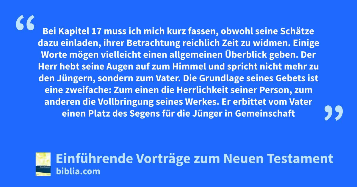 Bei Kapitel 17 muss ich mich kurz fassen, obwohl seine Schätze dazu einladen, ihrer Betrachtung reichlich Zeit zu widmen. Einige Worte mögen vielleicht einen allgemeinen Überblick geben. Der Herr hebt seine Augen auf zum Himmel und spricht nicht mehr zu den Jüngern, sondern zum Vater. Die Grundlage seines Gebets ist eine zweifache: Zum einen die Herrlichkeit seiner Person, zum anderen die Vollbringung seines Werkes. Er erbittet vom Vater einen Platz des Segens für die Jünger in Gemeinschaft mit Ihm in Übereinstimmung mit der Würde seiner Person und seines Werkes.