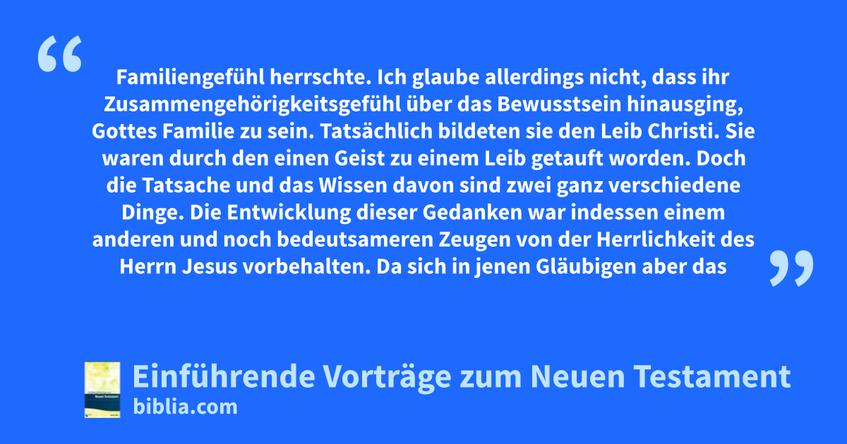 Es kam aber jede Seele Furcht an, und es geschahen viele Wunder und Zeichen durch die Apostel. Alle aber, welche glaubten, waren beisammen und hatten alles gemein (V. 43–44). Dieses einzigartige Verhalten – wunderschön und gesegnet zu seiner Zeit – zeigte sich in Jerusalem. Ich bezweifle jedoch nicht, dass es den Jerusalem-Zustand der Versammlung Gottes kennzeichnete. Wir verstehen dies gut. Zunächst einmal befanden sich damals alle Glieder der Kirche (Versammlung) an einem einzigen Ort. Daher erscheint es uns ganz natürlich, wenn unter ihnen ein wirkliches und starkes Familiengefühl herrschte. Ich glaube allerdings nicht, dass ihr Zusammengehörigkeitsgefühl über das Bewusstsein hinausging, Gottes Familie zu sein. Tatsächlich bildeten sie den Leib Christi. Sie waren durch den einen Geist zu einem Leib getauft worden. Doch die Tatsache und das Wissen davon sind zwei ganz verschiedene Dinge. Die Entwicklung dieser Gedanken war indessen einem anderen und noch bedeutsameren Zeugen von der Herrlichkeit des Herrn Jesus vorbehalten. Da sich in jenen Gläubigen aber das Bewusstsein von einer Familienbeziehung in voller Stärke entfaltete, erkennen wir als ihre Frucht den wunderbaren Sieg der Gnade über die Selbstsucht. Gehört er oder sie zum Haushalt Gottes? Das war der beherrschende Gedanke und nicht der eigene Besitz. Die Gnade gibt, ohne etwas zurückzuerwarten. Auch sucht die Gnade nicht das Ihrige, sondern das, was Christi ist.