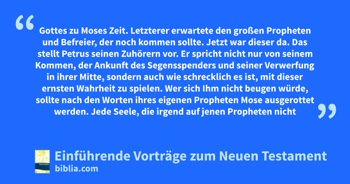 Danach forderte Petrus sie zu Buße und Bekehrung auf, damit ihre Sünden ausgelöscht und Zeiten der Erquickung vom Angesicht des Herrn kommen konnten und er den euch zuvorverordneten Jesus Christus sende, welchen freilich der Himmel aufnehmen muss bis zu den Zeiten der Wiederherstellung aller Dinge, von welchen Gott durch den Mund seiner heiligen Propheten von jeher geredet hat (V. 20–21). Gott hatte sein durch den Propheten Mose ausgesprochenes Wort erfüllt; denn Mose war keineswegs der Erretter Israels, sondern nur ein Zeuge der Erlösung in einem schwachen Beispiel von der Macht Gottes zu Moses Zeit. Letzterer erwartete den großen Propheten und Befreier, der noch kommen sollte. Jetzt war dieser da. Das stellt Petrus seinen Zuhörern vor. Er spricht nicht nur von seinem Kommen, der Ankunft des Segensspenders und seiner Verwerfung in ihrer Mitte, sondern auch wie schrecklich es ist, mit dieser ernsten Wahrheit zu spielen. Wer sich Ihm nicht beugen würde, sollte nach den Worten ihres eigenen Propheten Mose ausgerottet werden. Jede Seele, die irgend auf jenen Propheten nicht hören wird, soll aus dem Volke ausgerottet werden (V. 23). Auch alle anderen Propheten hatten von diesen Tagen geredet. Die Juden waren die Söhne der Propheten und des Bundes, den Gott mit ihren Vätern geschlossen hatte, indem Er zu Abraham sagte: Und in deinem Samen werden gesegnet werden alle Geschlechter der Erde (V. 25). Dieser Same war jetzt gekommen. Daher mussten sie sich entscheiden. Ach, sie hatten schon ihren Willen gegen Ihn durchgesetzt! Aber auf seine Fürsprache hin (welche Gnade!) war Gott bereit, ihnen alles zu vergeben. Sie hatten nur Buße zu tun und sich zu bekehren, damit ihre Sünden ausgelöscht würden.