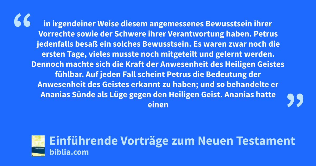 Dies ist jedoch ein äußerst ernster Irrtum; und ich bezweifle sehr, ob alle jene, die dem Anschein und dem Bekenntnis nach die Gegenwart des Geistes Gottes auf der Erde anerkennen, auch ein in irgendeiner Weise diesem angemessenes Bewusstsein ihrer Vorrechte sowie der Schwere ihrer Verantwortung haben. Petrus jedenfalls besaß ein solches Bewusstsein. Es waren zwar noch die ersten Tage, vieles musste noch mitgeteilt und gelernt werden. Dennoch machte sich die Kraft der Anwesenheit des Heiligen Geistes fühlbar. Auf jeden Fall scheint Petrus die Bedeutung der Anwesenheit des Geistes erkannt zu haben; und so behandelte er Ananias Sünde als Lüge gegen den Heiligen Geist. Ananias hatte einen Teil des Kaufpreises für das Landstück zurückbehalten. Blieb es nicht dein, wenn es so blieb, und war es nicht, nachdem es verkauft war, in deiner Gewalt? (V. 4). Es gehörte ihm immer noch. Was ist es, dass du dir diese Tat in deinem Herzen vorgenommen hast? Nicht Menschen hast du gelogen, sondern Gott.